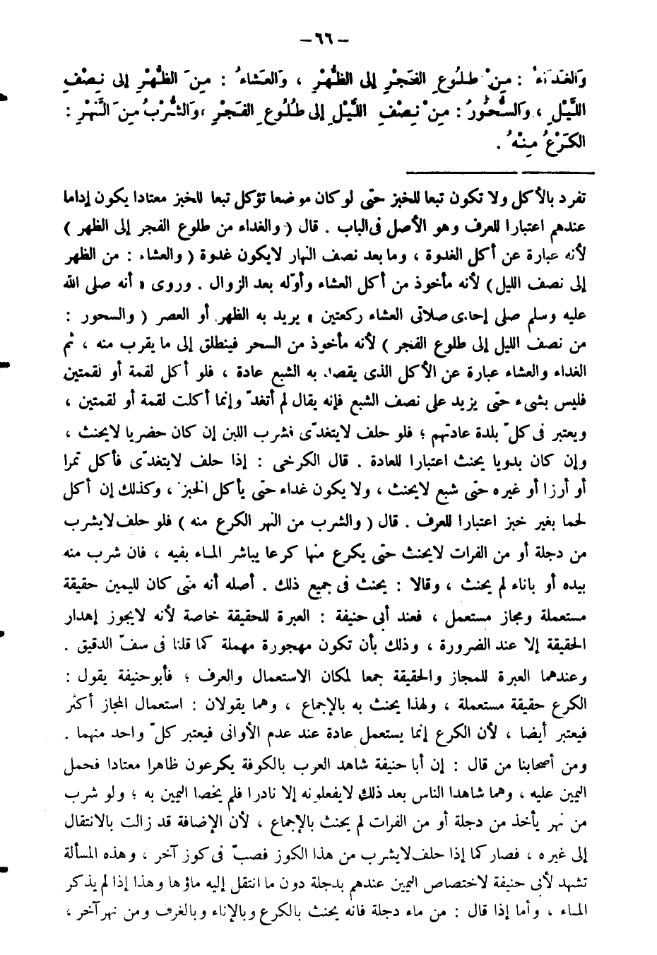 وَالْغَدَاءُ: مِنْ طُلُوعِ الْفَجْرِ إِلَى الظُّهْرِ، وَالْعَشَاءُ: مِنَ الظُّهْرِ إِلَى نِصْفِ الْلَيْلِ، وَالسُّحُورُ: مِنْ نِصْفِ اللَّيْلِ إِلَى طُلُوعِ الْفَجْرِ، وَالشُّرْبُ مِنَ النَّهْرِ: الْكَرْعُ مِنْهُ.