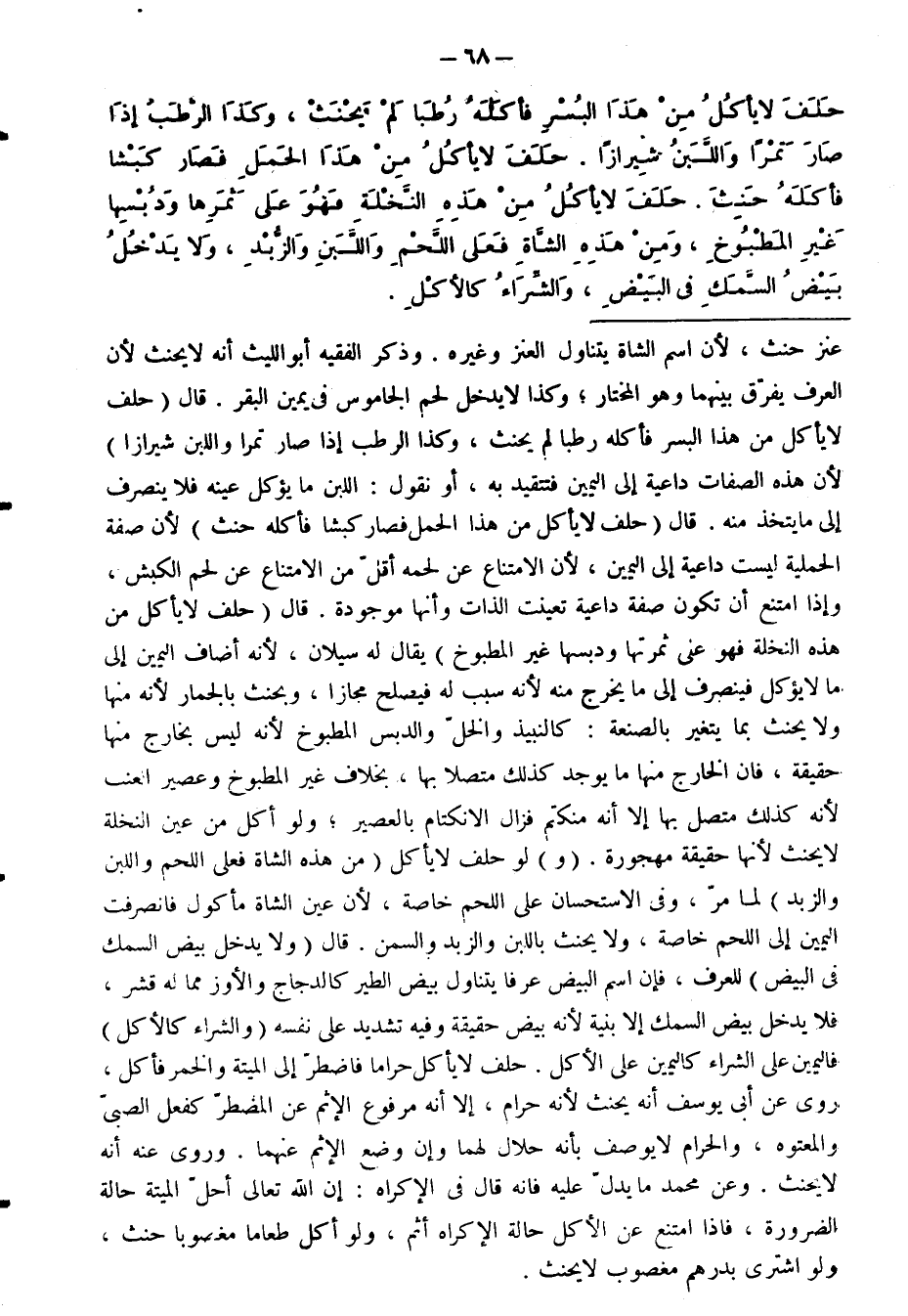 حَلَفَ لَا يَأْكُلُ حَرَامًا فَاضْطَرَّ إِلَى الْمِيتَةِ وَالْخَمْرِ فَأَكَلَ، رُوِيَ عَنْ أَبِي يُوسُفَ أَنَّهُ يَحْنَثُ لِأَنَّهُ حَرَامٌ، إِلَّا أَنَّهُ مَرْفُوعُ الْإِثْمِ عَنِ الْمُضْطَرِّ كَفِعْلِ الصَّبِيِّ وَالْمَعْتُوهِ، وَالْحَرَامُ لَا يُوصَفُ بِأَنَّهُ حَلَالٌ لَهُمَا وَإِنْ وُضِعِ الْإِثْمُ عَنْهُمَا. وَرُوِيَ عَنْهُ أَنَّهُ لَا يَحْنَثُ. وَعَنْ مُحَمَّدٍ مَا يَدُلُّ عَلَيْهِ فَإِنَّهُ قَالَ فِي الْإِكْرَاهِ: إِنَّ اللَّهَ تَعَالَى أَحَلَّ الْمَيْتَةَ حَالَةَ الضَّرُورَةِ، فَإِذَا امْتَنَعَ عَنِ الْأَكْلِ حَالَةَ الْإِكْرَاهِ أَثِمَ، وَلَوْ أَكَلَ طَعَامًا مَغْصُوبًا حَنِثَ، وَلَوِ اشْتَرَى بِدِرْهَمٍ مَغْصُوبٍ لَا يَحْنَثُ.