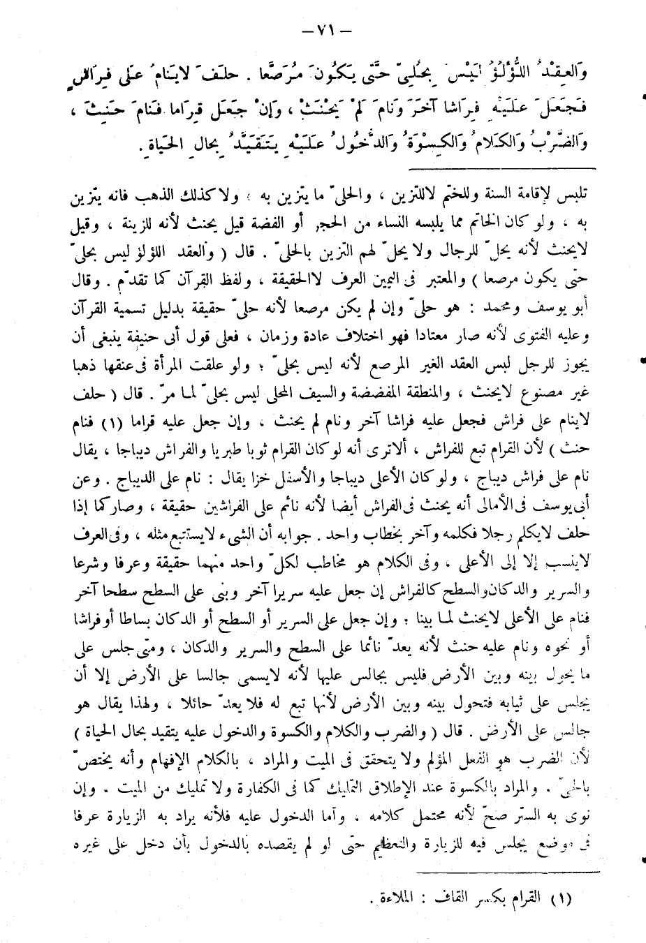 وَالْعِقْدُ اللُّؤْلُؤُ لَيْسَ بِحُلِيٍّ حَتَّى يَكُونَ مُرَصَّعًا. حَلَفَ لَا يَنَامُ عَلَى فِرَاشٍ فَجَعَلَ عَلَيْهِ فِرَاشًا آخَرَ وَنَامَ لَمْ يَحْنَثْ، وَإِنْ جَعَلَ قِرَامًا فَنَامَ حَنِثَ، وَالضَّرْبُ وَالْكَلَامُ وَالْكِسْوَةُ وَالدُّخُولُ عَلَيْهِ يَتَقَيَّدُ بِحَالِ الْحَيَاةِ.