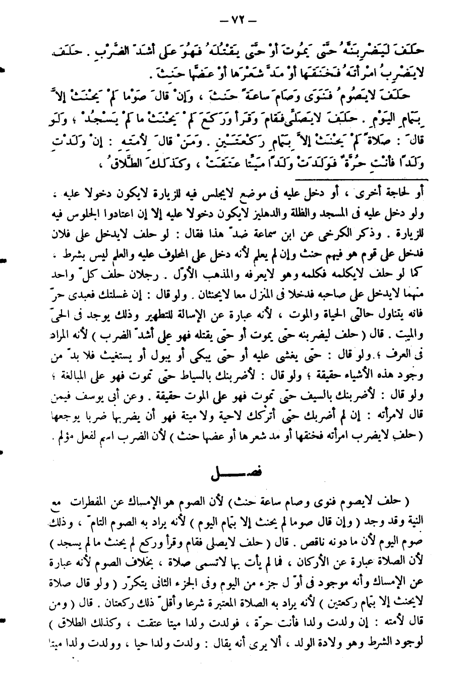 حَلَفَ لَيَضْرِبَنَّهُ حَتَّى يَمُوتَ أَوْ حَتَّى يَقْتُلَهُ فَهُوَ عَلَى أَشَدِّ الضَّرْبِ. حَلَفَ لَا يَضْرِبُ امْرَأَتَهُ فَخَنَقَهَا أَوْ مَدَّ شَعْرَهَا أَوْ عَضَّهَا حَنِثَ.