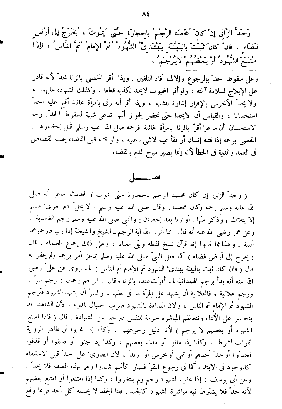 فَصْلٌ (وَحَدُّ الزَّانِي إِنْ كَانَ مُحْصَنًا الرَّجْمُ بِالْحِجَارَةِ حَتَّى يَمُوتَ) لِحَدِيثِ مَاعِزٍ أَنَّهُ - صَلَّى اللَّهُ عَلَيْهِ وَسَلَّمَ - رَجَمَهُ وَكَانَ مُحْصَنًا. وَقَالَ - صَلَّى اللَّهُ عَلَيْهِ وَسَلَّمَ -: «لَا يَحِلُّ دَمُ امْرِئٍ مُسْلِمٍ إِلَّا بِثَلَاثٍ " وَذَكَرَ مِنْهَا " أَوْ زِنًا بَعْدَ إِحْصَانٍ» وَالنَّبِيُّ - صَلَّى اللَّهُ عَلَيْهِ وَسَلَّمَ - رَجَمَ الْغَامِدِيَّةَ.