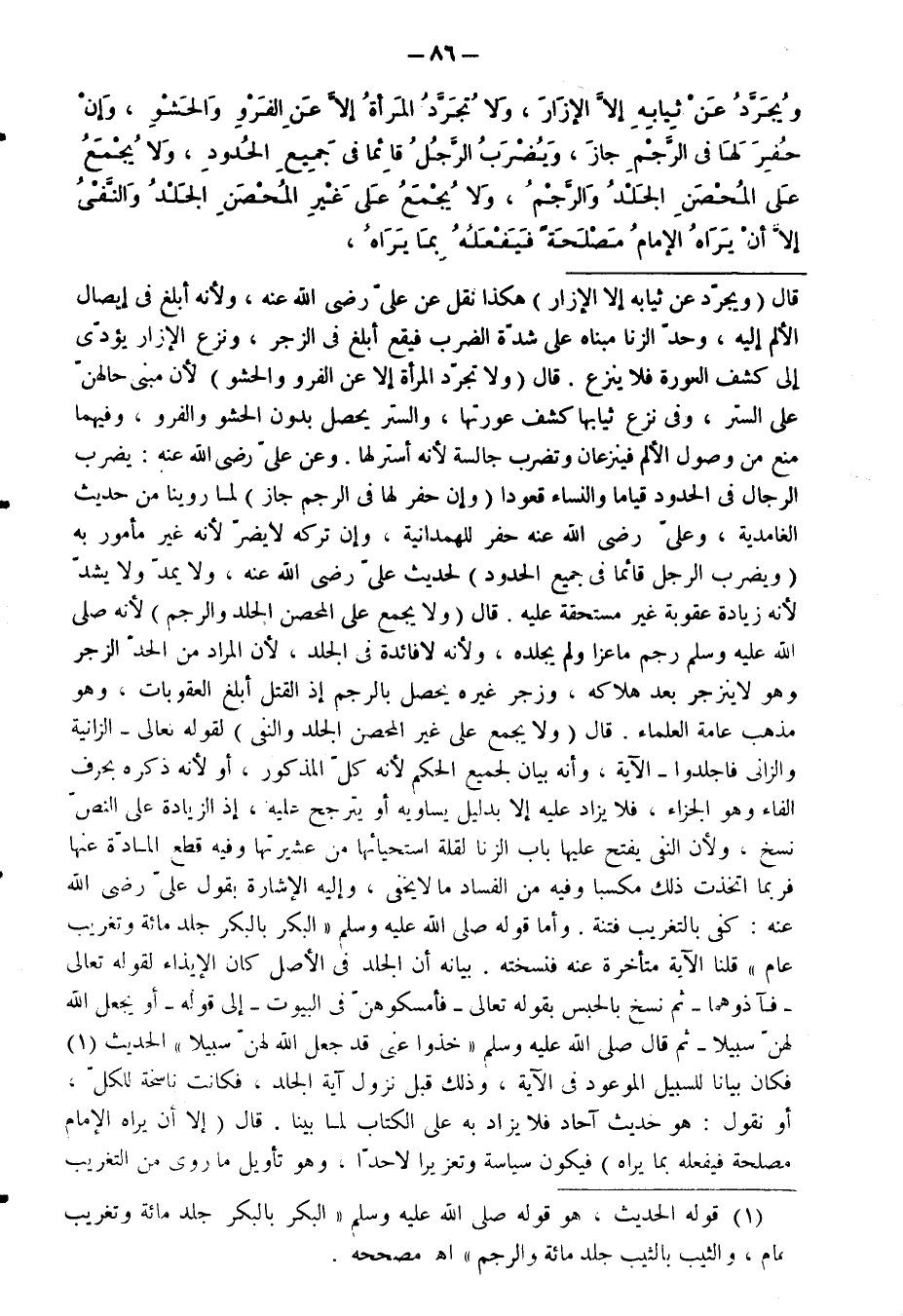 قَالَ: (وَلَا يَجْمَعُ عَلَى غَيْرِ الْمُحْصَنِ الْجَلْدُ وَالنَّفْيُ) لِقَوْلِهِ تَعَالَى: {الزَّانِيَةُ وَالزَّانِي فَاجْلِدُوا} [النور: 2] الْآيَةَ، وَأَنَّهُ بَيَانٌ لِجَمِيعِ الْحُكْمِ لِأَنَّهُ كُلُّ الْمَذْكُورِ، أَوْ لِأَنَّهُ ذَكَرَهُ بِحَرْفِ الْفَاءِ وَهُوَ الْجَزَاءُ، فَلَا يُزَادُ عَلَيْهِ إِلَّا بِدَلِيلٍ يُسَاوِيهِ أَوْ يَتَرَجَّحُ عَلَيْهِ، إِذِ الزِّيَادَةُ عَلَى النَّصِّ نَسْخٌ، وَلِأَنَّ النَّفْيَ يَفْتَحُ عَلَيْهَا بَابَ الزِّنَا لِقِلَّةِ اسْتِحْيَائِهَا مِنْ عَشِيرَتِهَا وَفِيهِ قَطْعُ الْمَادَّةِ عَنْهَا فَرُبَّمَا اتَّخَذَتْ ذَلِكَ مَكْسَبًا وَفِيهِ مِنَ الْفَسَادِ مَا لَا يَخْفَى، وَإِلَيْهِ الْإِشَارَةُ بِقَوْلِ عَلِيٍّ - رَضِيَ اللَّهُ عَنْهُ -: كَفَى بِالتَّغْرِيبِ فِتْنَةً وَأَمَّا قَوْلُهُ - صَلَّى اللَّهُ عَلَيْهِ وَسَلَّمَ -: «الْبِكْرُ بِالْبِكْرِ جَلْدُ مِائَةٍ وَتَغْرِيبُ عَامٍ» قُلْنَا: الْآيَةُ مُتَأَخِّرَةٌ عَنْهُ فَنَسَخَتْهُ. بَيَانُهُ أَنَّ الْجَلْدَ فِي الْأَصْلِ كَانَ الْإِيذَاءَ لِقَوْلِهِ تَعَالَى: (فَآذُوهُمَا) ثُمَّ نُسِخَ بِالْحَبْسِ بِقَوْلِهِ تَعَالَى: {فَأَمْسِكُوهُنَّ فِي الْبُيُوتِ} [النساء: 15] إِلَى قَوْلِهِ: {أَوْ يَجْعَلَ اللَّهُ لَهُنَّ سَبِيلا} [النساء: 15] ثُمَّ قَالَ - صَلَّى اللَّهُ عَلَيْهِ وَسَلَّمَ - «خُذُوا عَنِّي قَدْ جَعَلَ اللَّهُ لَهُنَّ سَبِيلًا» الْحَدِيثَ فَكَانَ بَيَانًا لِلسَّبِيلِ الْمَوْعُودِ فِي الْآيَةِ، وَذَلِكَ قَبْلَ نُزُولِ آيَةِ الْجَلْدِ، فَكَانَتْ نَاسِخَةً لِلْكُلِّ، أَوْ نَقُولُ: هُوَ حَدِيثُ آحَادٍ فَلَا يُزَادُ بِهِ عَلَى الْكِتَابِ لِمَا بَيَّنَّا.