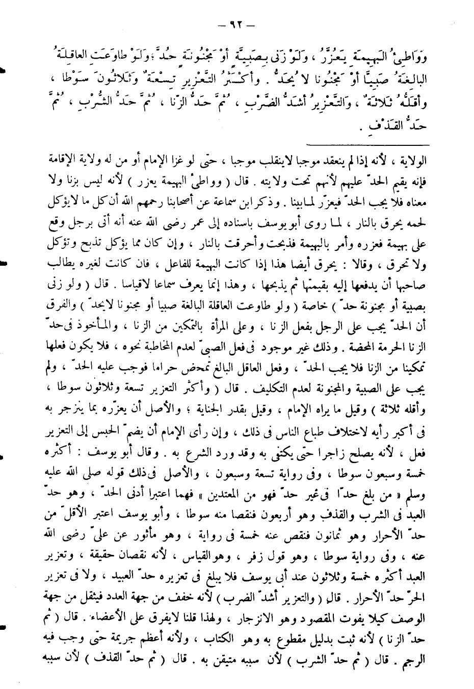 وَوَاطِئُ الْبَهِيمَةِ يَعُزَّرُ، وَلَوْ زَنَى بِصَبِيَّةٍ أَوْ مَجْنُونَةٍ حُدَّ؛ وَلَوْ طَاوَعَتِ الْعَاقِلَةُ الْبَالِغَةُ صَبِيًّا أَوْ مَجْنُونًا لَا يُحَدُّ، وَأَكْثَرُ التَّعْزِيرِ تِسْعَةٌ وَثَلَاثُونَ سَوْطًا، وَأَقَلُّهُ ثَلَاثَةٌ، وَالتَّعْزِيرُ أَشَدُّ الضَّرْبِ، ثُمَّ حَدُّ الزِّنَا، ثُمَّ حَدُّ الشُّرْبِ، ثُمَّ حَدُّ الْقَذْفِ.