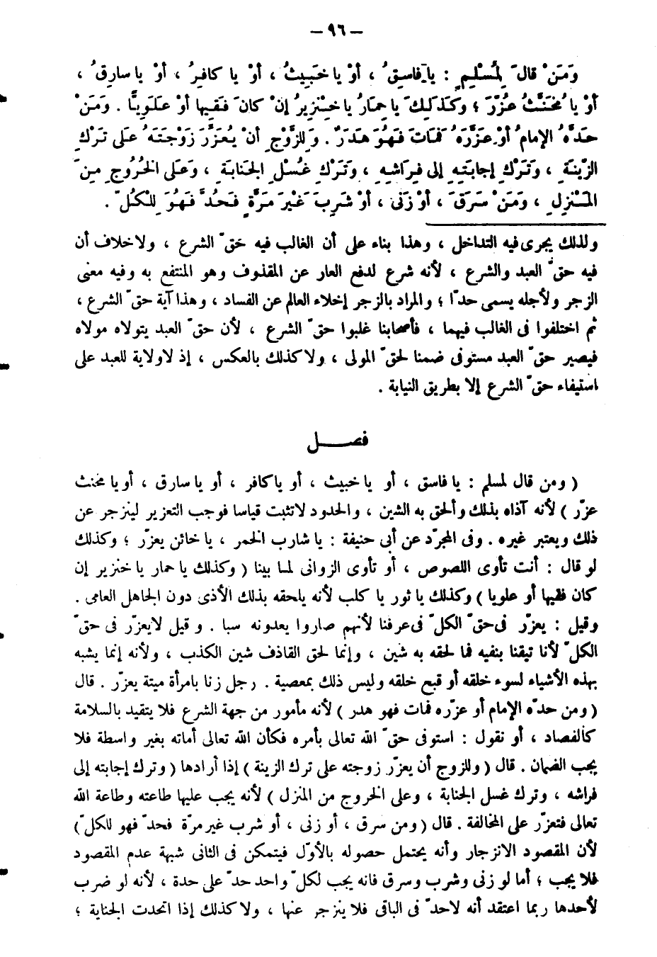 وَمَنْ قَالَ لِمُسْلِمٍ: يَا فَاسِقُ، أَوْ يَا خَبِيثُ، أَوْ يَا كَافِرُ، أَوْ يَا سَارِقُ، أَوْ يَا مُخَنَّثُ عُزِّرَ؛ وَكَذَلِكَ يَا حِمَارُ يَا خِنْزِيرُ إِنْ كَانَ فَقِيهًا أَوْ عَلَوِيًّا. وَمَنْ حَدَّهُ الْإِمَامُ أَوْ عَزَّرَهُ فَمَاتَ فَهُوَ هَدَرٌ؛ وَلِلزَّوْجِ أَنْ يُعَزِّرَ زَوْجَتَهُ عَلَى تَرْكِ الزِّينَةِ، وَتَرْكِ إِجَابَتِهِ إِلَى فِرَاشِهِ، وَتَرْكِ غُسْلِ الْجَنَابَةِ، وَعَلَى الْخُرُوجِ مِنَ الْمَنْزِلِ، وَمَنْ سَرَقَ، أَوْ زَنَى، أَوْ شَرِبَ غَيْرَ مَرَةٍ فَحُدَّ فَهُوَ لِلْكُلِّ.