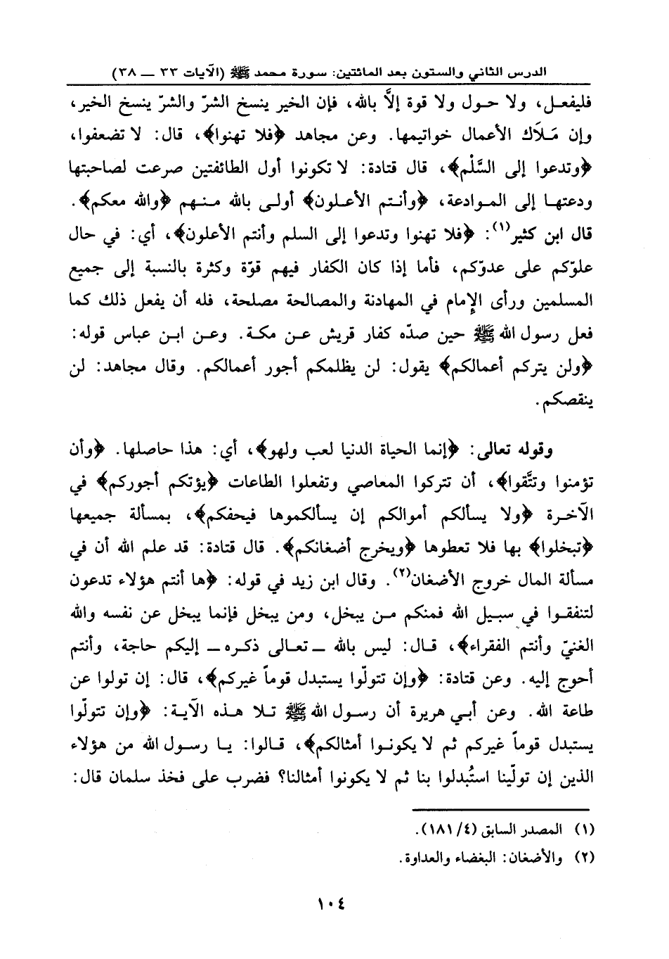 فليفعل، ولا حول ولا قوة إلا بالله، فإن الخير ينسخ الشر، والشر ينسخ الخير، وإن ملاك الأعمال خواتيمها. وعن مجاهد: {فَلَا تَهِنُوا} ، قال: لا تضعفوا، {وَتَدْعُوا إِلَى السَّلْمِ} ، قال قتادة: لا تكونوا أول الطائفتين صرعت لصاحبتها ودعتها إلى الموادعة، {وَأَنتُمُ الْأَعْلَوْنَ} أولى بالله منهم {وَاللَّهُ مَعَكُمْ} . قال ابن كثير: {فَلَا تَهِنُوا وَتَدْعُوا إِلَى السَّلْمِ وَأَنتُمُ الْأَعْلَوْنَ} ، أي: في حال علوكم على عدوكم، فأما إذا كان الكفار فيهم قوة وكثرة بالنسبة إلى جميع المسلمين ورأى الإمام في المهادنة والمصالحة مصلحة فله أن يفعل ذلك كما فعل رسول الله - صلى الله عليه وسلم - حين صده كفار قريش عن مكة. وعن ابن عباس قوله: {وَلَن يَتِرَكُمْ أَعْمَالَكُمْ} ، يقول: لن يظلمكم أجور أعمالكم. وقال مجاهد: لن ينقصكم.