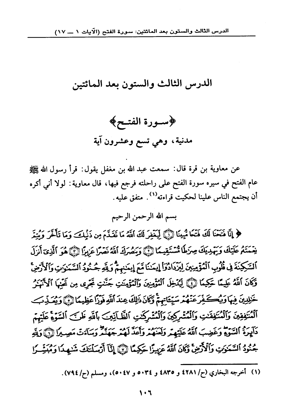 {إِنَّا فَتَحْنَا لَكَ فَتْحاً مُّبِيناً (1) لِيَغْفِرَ لَكَ اللَّهُ مَا تَقَدَّمَ مِن ذَنبِكَ وَمَا تَأَخَّرَ وَيُتِمَّ نِعْمَتَهُ عَلَيْكَ وَيَهْدِيَكَ صِرَاطاً مُّسْتَقِيماً (2) وَيَنصُرَكَ اللَّهُ نَصْراً عَزِيزاً (3) هُوَ الَّذِي أَنزَلَ السَّكِينَةَ فِي قُلُوبِ الْمُؤْمِنِينَ لِيَزْدَادُوا إِيمَاناً مَّعَ إِيمَانِهِمْ وَلِلَّهِ جُنُودُ السَّمَاوَاتِ وَالْأَرْضِ وَكَانَ اللَّهُ عَلِيماً حَكِيماً (4) لِيُدْخِلَ الْمُؤْمِنِينَ وَالْمُؤْمِنَاتِ جَنَّاتٍ تَجْرِي مِن تَحْتِهَا الْأَنْهَارُ خَالِدِينَ فِيهَا وَيُكَفِّرَ عَنْهُمْ سَيِّئَاتِهِمْ وَكَانَ ذَلِكَ عِندَ اللَّهِ فَوْزاً عَظِيماً (5) وَيُعَذِّبَ الْمُنَافِقِينَ وَالْمُنَافِقَاتِ وَالْمُشْرِكِينَ وَالْمُشْرِكَاتِ الظَّانِّينَ بِاللَّهِ ظَنَّ السَّوْءِ عَلَيْهِمْ دَائِرَةُ السَّوْءِ وَغَضِبَ اللَّهُ عَلَيْهِمْ وَلَعَنَهُمْ وَأَعَدَّ لَهُمْ جَهَنَّمَ وَسَاءتْ مَصِيراً (6) وَلِلَّهِ جُنُودُ السَّمَاوَاتِ وَالْأَرْضِ وَكَانَ اللَّهُ عَزِيزاً حَكِيماً (7) إِنَّا أَرْسَلْنَاكَ شَاهِداً وَمُبَشِّراً