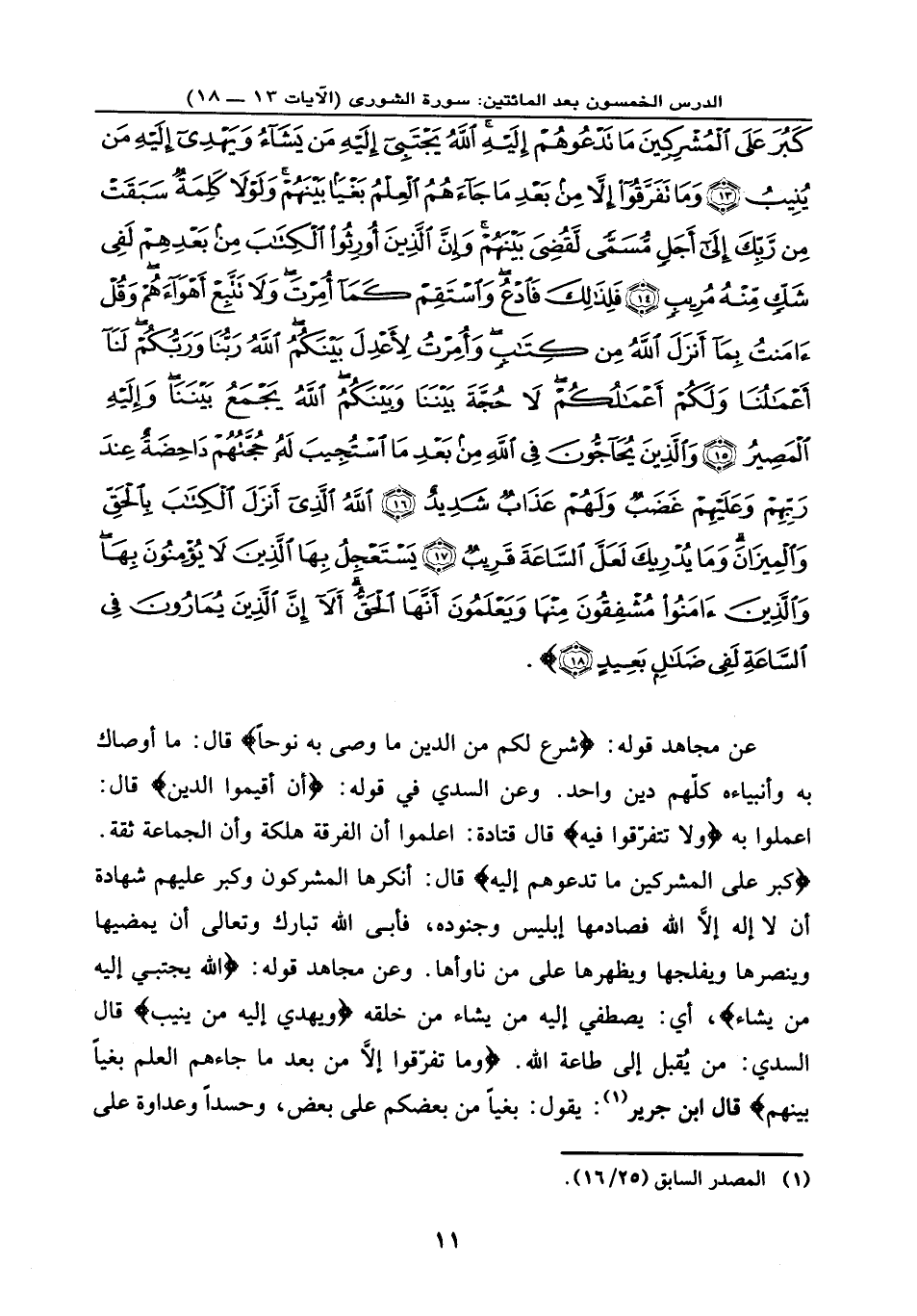 كَبُرَ عَلَى الْمُشْرِكِينَ مَا تَدْعُوهُمْ إِلَيْهِ اللَّهُ يَجْتَبِي إِلَيْهِ مَن يَشَاءُ وَيَهْدِي إِلَيْهِ مَن يُنِيبُ (13) وَمَا تَفَرَّقُوا إِلَّا مِن بَعْدِ مَا جَاءهُمُ الْعِلْمُ بَغْياً بَيْنَهُمْ وَلَوْلَا كَلِمَةٌ سَبَقَتْ مِن رَّبِّكَ إِلَى أَجَلٍ مُّسَمًّى لَّقُضِيَ بَيْنَهُمْ وَإِنَّ الَّذِينَ أُورِثُوا الْكِتَابَ مِن بَعْدِهِمْ لَفِي شَكٍّ مِّنْهُ مُرِيبٍ (14) فَلِذَلِكَ فَادْعُ وَاسْتَقِمْ كَمَا أُمِرْتَ وَلَا تَتَّبِعْ أَهْوَاءهُمْ وَقُلْ آمَنتُ بِمَا أَنزَلَ اللَّهُ مِن كِتَابٍ وَأُمِرْتُ لِأَعْدِلَ بَيْنَكُمُ اللَّهُ رَبُّنَا وَرَبُّكُمْ لَنَا أَعْمَالُنَا وَلَكُمْ أَعْمَالُكُمْ لَا حُجَّةَ بَيْنَنَا وَبَيْنَكُمُ اللَّهُ يَجْمَعُ بَيْنَنَا وَإِلَيْهِ الْمَصِيرُ (15) وَالَّذِينَ يُحَاجُّونَ فِي اللَّهِ مِن بَعْدِ مَا اسْتُجِيبَ لَهُ حُجَّتُهُمْ دَاحِضَةٌ عِندَ رَبِّهِمْ وَعَلَيْهِمْ غَضَبٌ وَلَهُمْ عَذَابٌ شَدِيدٌ (16) اللَّهُ الَّذِي أَنزَلَ الْكِتَابَ بِالْحَقِّ وَالْمِيزَانَ وَمَا يُدْرِيكَ لَعَلَّ السَّاعَةَ قَرِيبٌ (17) يَسْتَعْجِلُ بِهَا الَّذِينَ لَا يُؤْمِنُونَ بِهَا وَالَّذِينَ آمَنُوا مُشْفِقُونَ مِنْهَا وَيَعْلَمُونَ أَنَّهَا الْحَقُّ أَلَا إِنَّ الَّذِينَ يُمَارُونَ فِي السَّاعَةِ لَفِي ضَلَالٍ بَعِيدٍ (18) } .