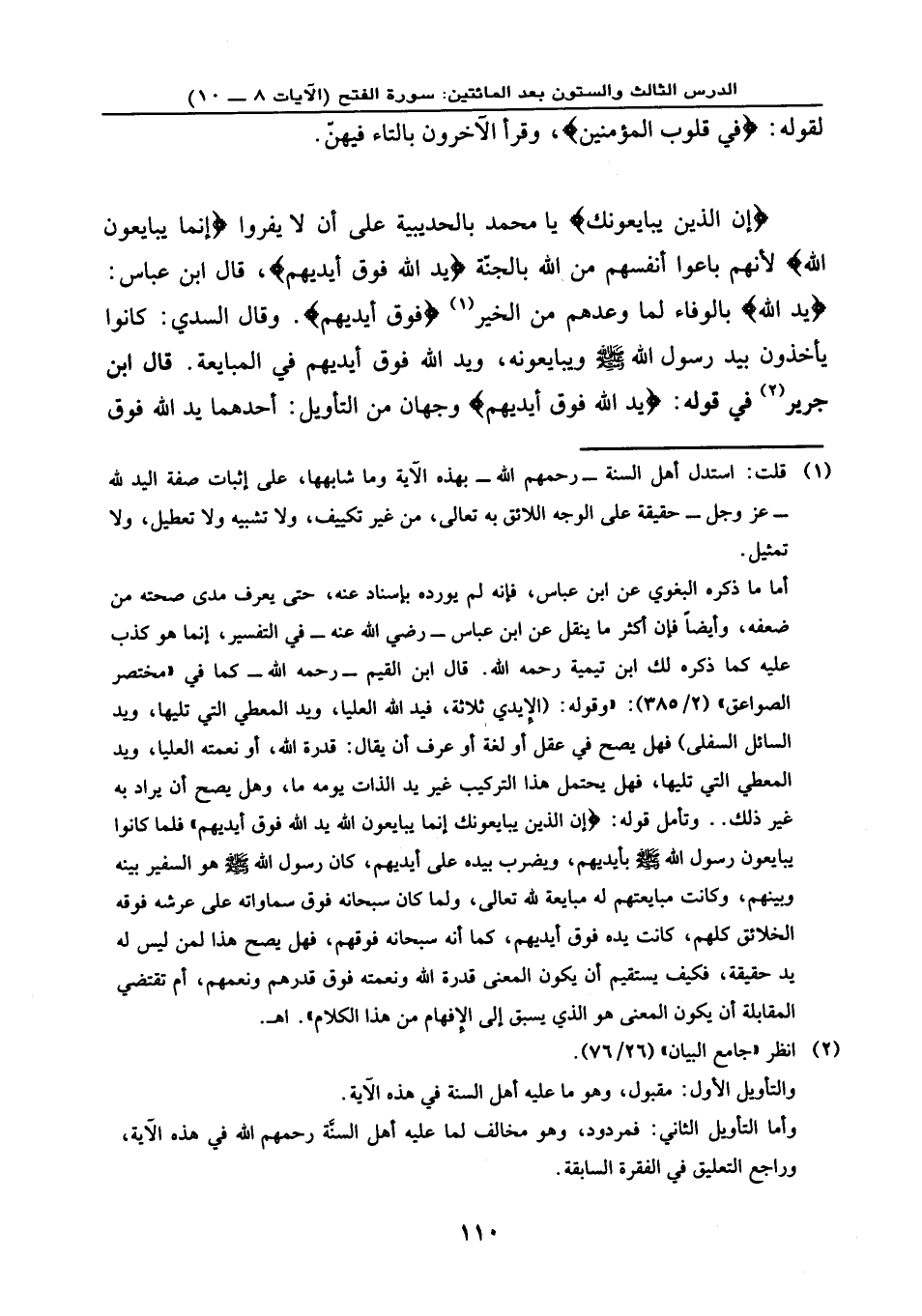 {إِنَّ الَّذِينَ يُبَايِعُونَكَ} يا محمد بالحديبية على أن لا يفروا {إِنَّمَا يُبَايِعُونَ اللَّهَ} لأنهم باعوا أنفسهم من الله بالجنة، {يَدُ اللَّهِ فَوْقَ أَيْدِيهِمْ} ، قال ابن عباس: {يَدُ اللَّهِ} بالوفاء لما وعدهم من الخير، {فَوْقَ أَيْدِيهِمْ} ، وقال السدي: كانوا يأخذون بيد رسول الله - صلى الله عليه وسلم - ويبايعونه، ويدُ اللهِ فوق أيديهم في المبايعة: قال ابن جرير في قوله: {يَدُ اللَّهِ فَوْقَ أَيْدِيهِمْ} وجهان من التأويل أحدهما: يد الله فوق