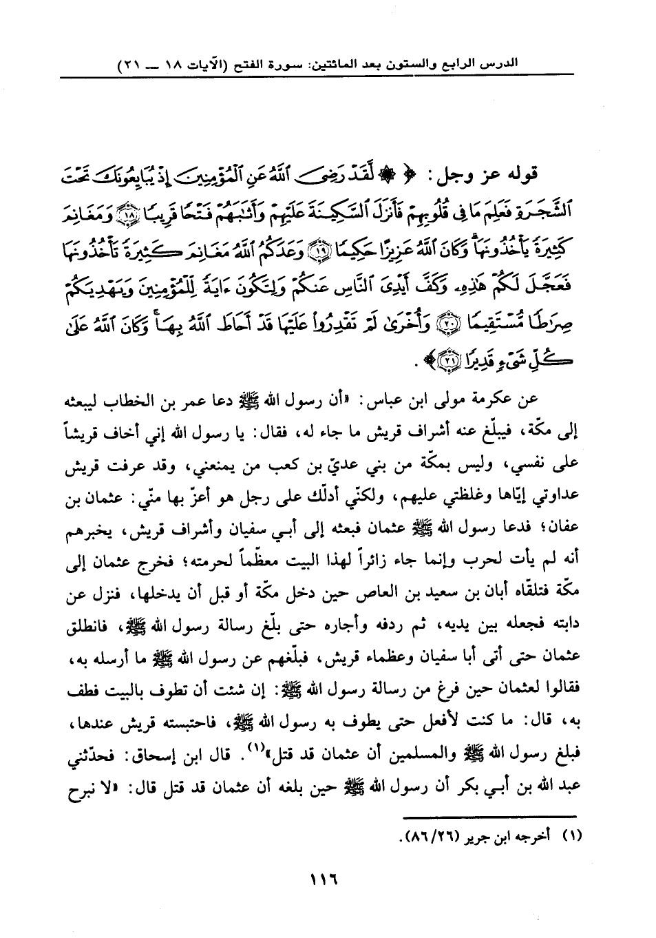 قوله عز وجل: {لَقَدْ رَضِيَ اللَّهُ عَنِ الْمُؤْمِنِينَ إِذْ يُبَايِعُونَكَ تَحْتَ الشَّجَرَةِ فَعَلِمَ مَا فِي قُلُوبِهِمْ فَأَنزَلَ السَّكِينَةَ عَلَيْهِمْ وَأَثَابَهُمْ فَتْحاً قَرِيباً (18) وَمَغَانِمَ كَثِيرَةً يَأْخُذُونَهَا وَكَانَ اللَّهُ عَزِيزاً حَكِيماً (19) وَعَدَكُمُ اللَّهُ مَغَانِمَ كَثِيرَةً تَأْخُذُونَهَا فَعَجَّلَ لَكُمْ هَذِهِ وَكَفَّ أَيْدِيَ النَّاسِ عَنكُمْ وَلِتَكُونَ آيَةً لِّلْمُؤْمِنِينَ وَيَهْدِيَكُمْ صِرَاطاً مُّسْتَقِيماً (20) وَأُخْرَى ... لَمْ تَقْدِرُوا عَلَيْهَا قَدْ أَحَاطَ اللَّهُ بِهَا وَكَانَ اللَّهُ عَلَى كُلِّ شَيْءٍ قَدِيراً (21) } .