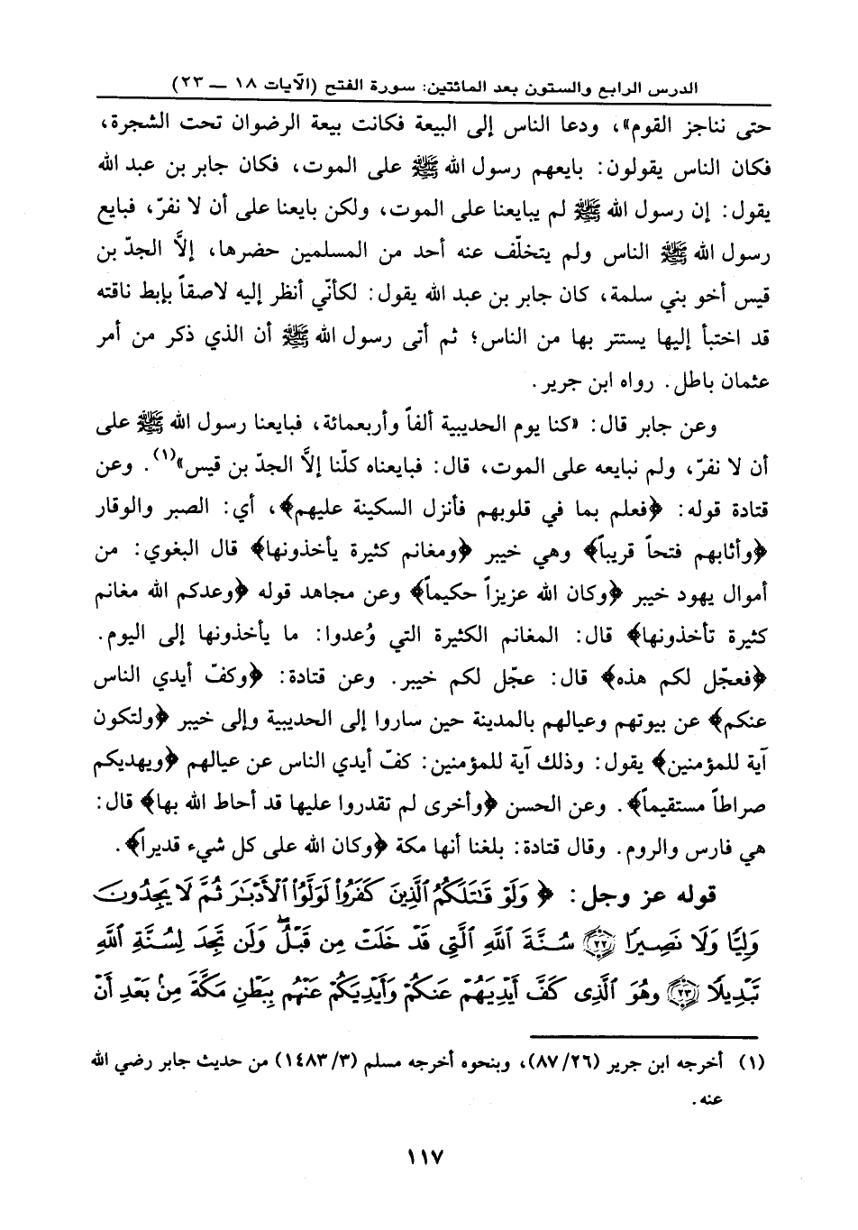 عن جابر قال: كنا يوم الحديبية ألفًا وأربعمائة فَبَايَعْنَا رسول الله - صلى الله عليه وسلم - على أن لا نفر، ولم نبايعه على الموت، قال: فبايعناه كلنا إلا الجد بن قيس. وعن قتادة: قوله: {فَعَلِمَ مَا فِي قُلُوبِهِمْ فَأَنزَلَ السَّكِينَةَ عَلَيْهِمْ} أي: الصبر والوقار، {وَأَثَابَهُمْ فَتْحاً قَرِيباً} وهي خيبر {وَمَغَانِمَ كَثِيرَةً يَأْخُذُونَهَا} ، قال البغوي: من أموال يهود خيبر {وَكَانَ اللَّهُ عَزِيزاً حَكِيماً} ، وعن مجاهد: قوله: {وَعَدَكُمُ اللَّهُ مَغَانِمَ كَثِيرَةً تَأْخُذُونَهَا} ، قال: المغانم الكثيرة التي وعدوا: ما يأخذونها إلى اليوم. {فَعَجَّلَ لَكُمْ هَذِهِ} ، قال: عجل لكم خيبر. وعن قتادة: {وَكَفَّ أَيْدِيَ النَّاسِ عَنكُمْ} عن بيوتهم وعيالهم بالمدينة حين ساروا إلى الحديبية وإلى خيبر {وَلِتَكُونَ آيَةً لِّلْمُؤْمِنِينَ} يقول: وذلك آية للمؤمنين: كف أيدي الناس عن عيالهم {وَيَهْدِيَكُمْ صِرَاطاً مُّسْتَقِيماً} . وعن الحسن: