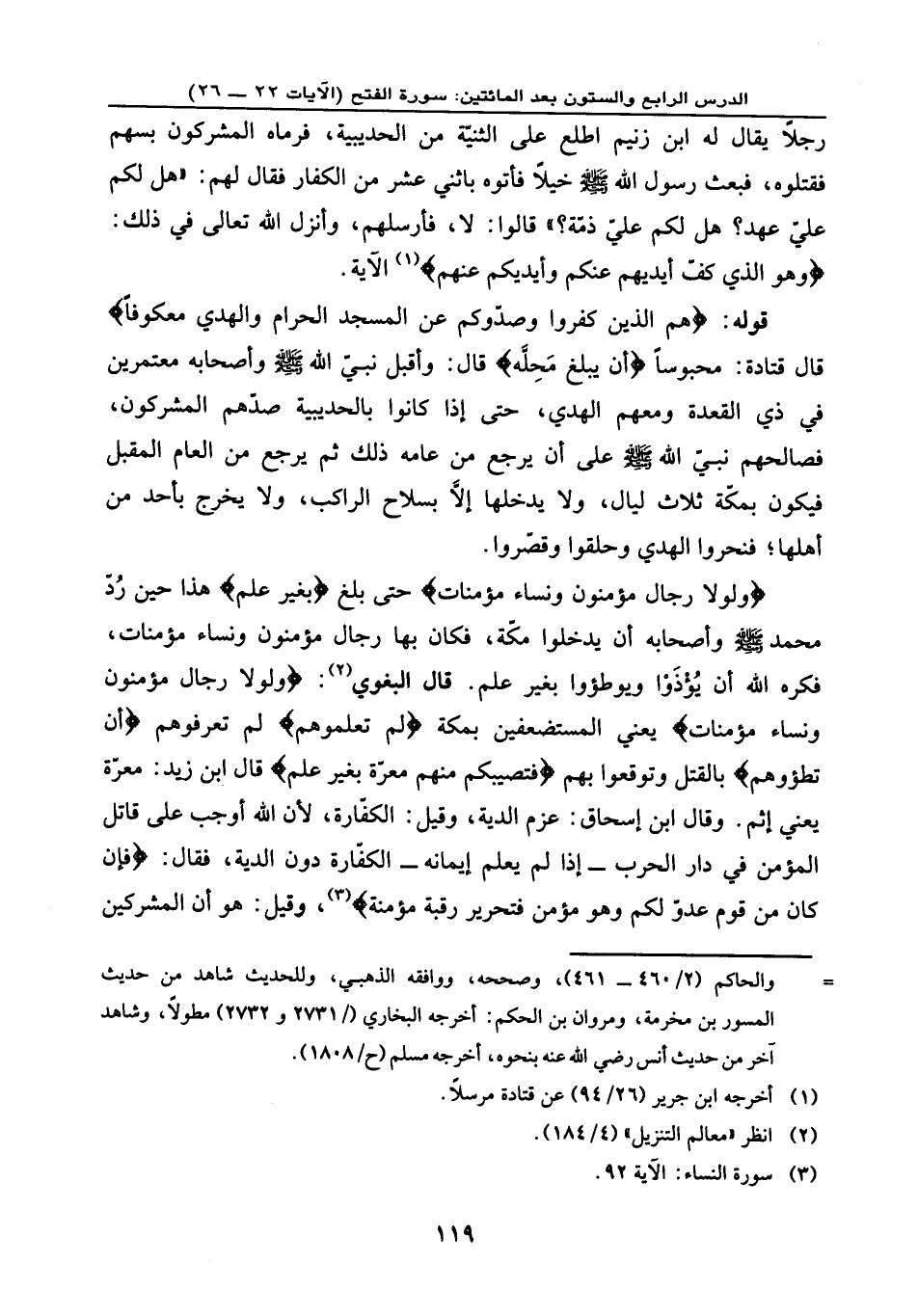 قوله: {هُمُ الَّذِينَ كَفَرُوا وَصَدُّوكُمْ عَنِ الْمَسْجِدِ الْحَرَامِ وَالْهَدْيَ مَعْكُوفاً} قال قتادة: محبوسًا {أَن يَبْلُغَ مَحِلَّهُ} قال: وأقبل نبي الله - صلى الله عليه وسلم - وأصحابه معتمرين في ذي القعدة ومعهم الهدي، حتى إذا كانوا بالحديبية صدهم المشركون فصالحهم نبي الله - صلى الله عليه وسلم - على أن يرجع من عامه ذلك ثم يرجع من العالم المقبل فيكون بمكة ثلاث ليال، ولا يدخلها إلا