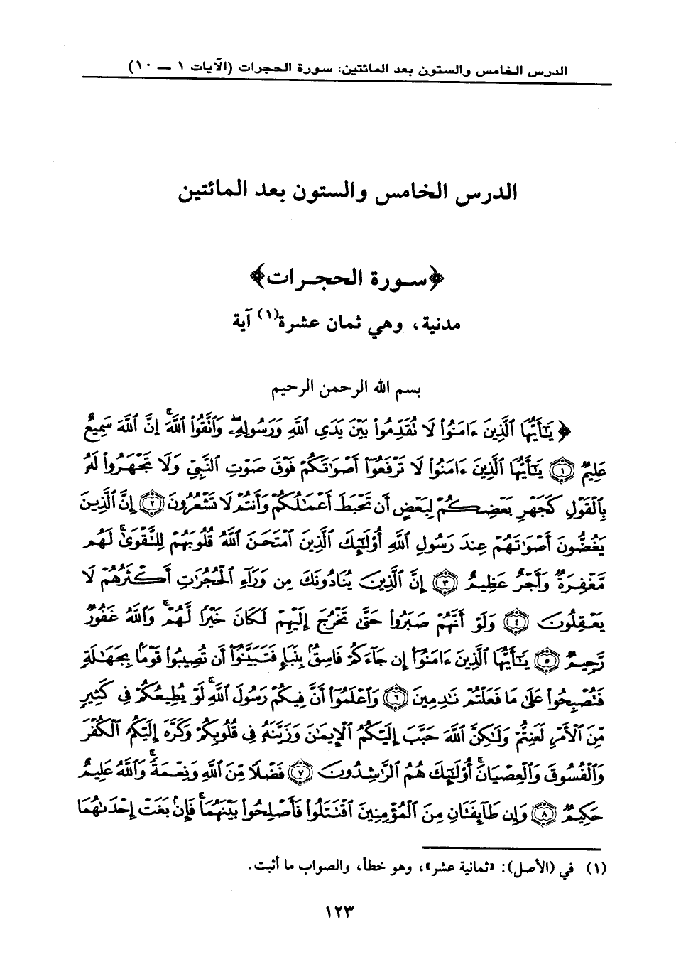 {يَا أَيُّهَا الَّذِينَ آمَنُوا لَا تُقَدِّمُوا بَيْنَ يَدَيِ اللَّهِ وَرَسُولِهِ وَاتَّقُوا اللَّهَ إِنَّ اللَّهَ سَمِيعٌ عَلِيمٌ (1) يَا أَيُّهَا الَّذِينَ آمَنُوا لَا تَرْفَعُوا أَصْوَاتَكُمْ فَوْقَ صَوْتِ النَّبِيِّ وَلَا تَجْهَرُوا لَهُ بِالْقَوْلِ كَجَهْرِ بَعْضِكُمْ لِبَعْضٍ أَن تَحْبَطَ أَعْمَالُكُمْ وَأَنتُمْ لَا تَشْعُرُونَ (2) إِنَّ الَّذِينَ يَغُضُّونَ أَصْوَاتَهُمْ عِندَ رَسُولِ اللَّهِ أُوْلَئِكَ الَّذِينَ امْتَحَنَ اللَّهُ قُلُوبَهُمْ لِلتَّقْوَى لَهُم مَّغْفِرَةٌ وَأَجْرٌ عَظِيمٌ (3) إِنَّ الَّذِينَ يُنَادُونَكَ مِن وَرَاء الْحُجُرَاتِ أَكْثَرُهُمْ لَا يَعْقِلُونَ (4) وَلَوْ أَنَّهُمْ صَبَرُوا حَتَّى تَخْرُجَ إِلَيْهِمْ لَكَانَ خَيْراً لَّهُمْ وَاللَّهُ غَفُورٌ رَّحِيمٌ (5) يَا أَيُّهَا الَّذِينَ آمَنُوا إِن جَاءكُمْ فَاسِقٌ بِنَبَأٍ فَتَبَيَّنُوا أَن تُصِيبُوا قَوْماً بِجَهَالَةٍ فَتُصْبِحُوا عَلَى مَا فَعَلْتُمْ نَادِمِينَ (6) وَاعْلَمُوا أَنَّ فِيكُمْ رَسُولَ اللَّهِ لَوْ يُطِيعُكُمْ فِي كَثِيرٍ مِّنَ الْأَمْرِ لَعَنِتُّمْ وَلَكِنَّ اللَّهَ حَبَّبَ إِلَيْكُمُ الْإِيمَانَ وَزَيَّنَهُ فِي قُلُوبِكُمْ وَكَرَّهَ إِلَيْكُمُ الْكُفْرَ وَالْفُسُوقَ وَالْعِصْيَانَ أُوْلَئِكَ هُمُ الرَّاشِدُونَ (7) فَضْلاً مِّنَ اللَّهِ وَنِعْمَةً وَاللَّهُ عَلِيمٌ حَكِيمٌ (8) وَإِن طَائِفَتَانِ مِنَ الْمُؤْمِنِينَ اقْتَتَلُوا فَأَصْلِحُوا بَيْنَهُمَا فَإِن بَغَتْ إِحْدَاهُمَا