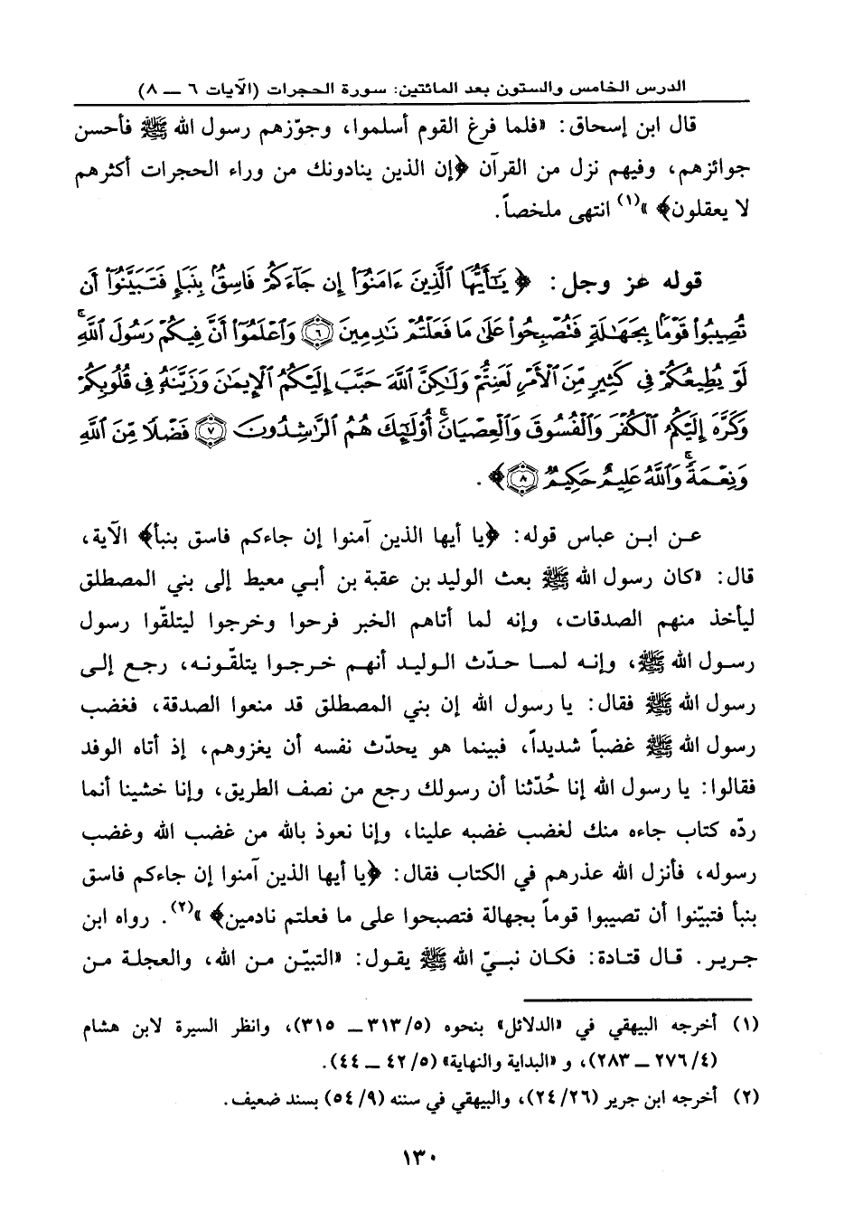 في الكتاب فقال: {يَا أَيُّهَا الَّذِينَ آمَنُوا إِن جَاءكُمْ فَاسِقٌ بِنَبَأٍ فَتَبَيَّنُوا أَن تُصِيبُوا قَوْماً بِجَهَالَةٍ فَتُصْبِحُوا عَلَى مَا فَعَلْتُمْ نَادِمِينَ} . رواه ابن جرير. قال قتادة: فكان نبي الله - صلى الله عليه وسلم - يقول: «التبين من الله، والعجلة من
