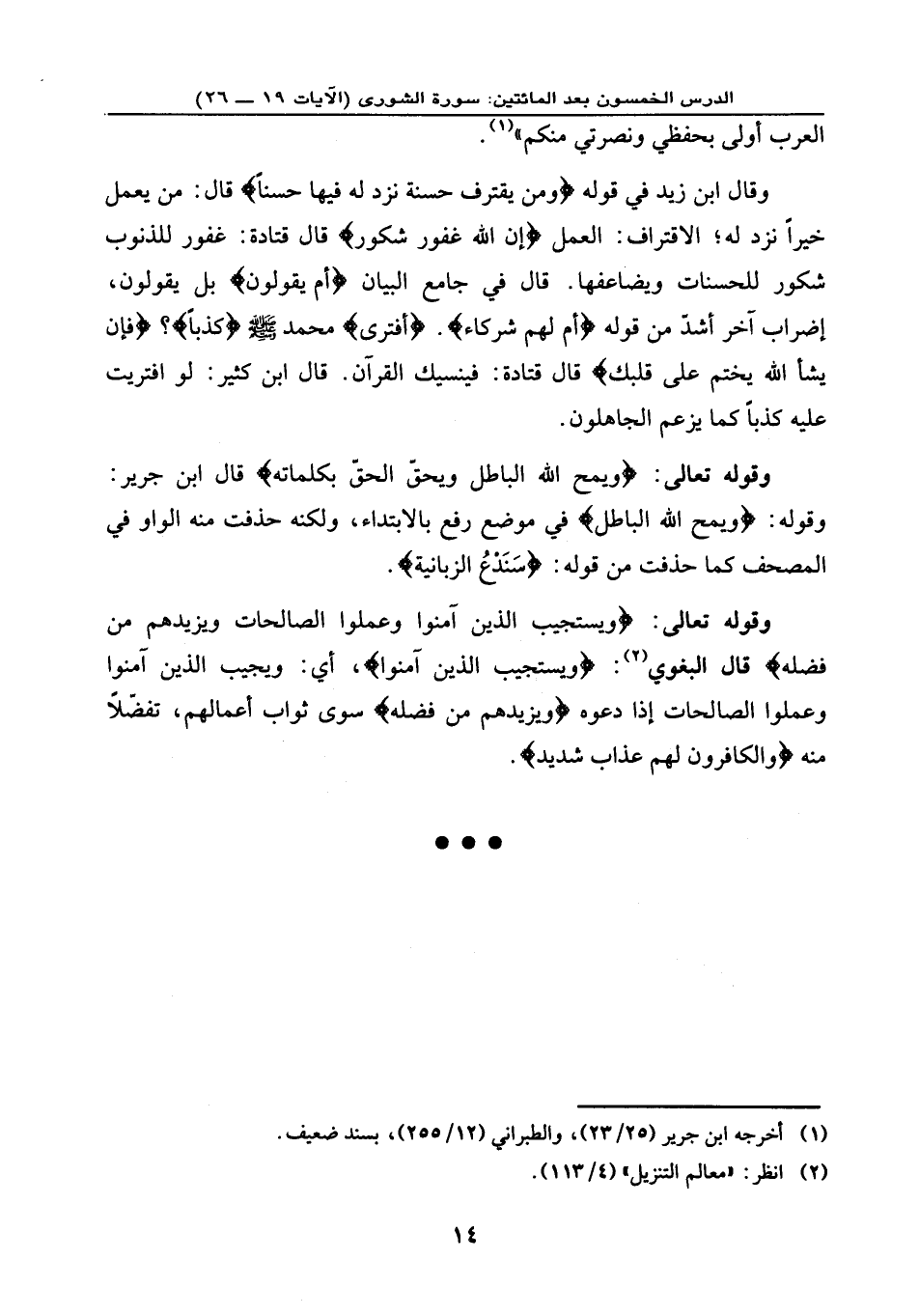 وقال ابن زيد في قوله: {وَمَن يَقْتَرِفْ حَسَنَةً نَّزِدْ لَهُ فِيهَا حُسْناً} قال: من يعمل خيرًا نزد له. الاقتراف: العمل {إِنَّ اللَّهَ غَفُورٌ شَكُورٌ} قال قتادة: غفور للذنوب، شكور للحسنات ويضاعفها. قال في جامع البيان: {أَمْ يَقُولُونَ} بل يقولون، إضراب آخر أشد من قوله: {أَمْ لَهُمْ شُرَكَاء} . {افْتَرَى} محمد - صلى الله عليه وسلم - {كَذِباً} ؟ {فَإِن يَشَأِ اللَّهُ يَخْتِمْ عَلَى قَلْبِكَ} ، قال قتادة: فينسيك القرآن. قال ابن كثير: لو افتريت عليه كذبًا كما يزعم الجاهلون.