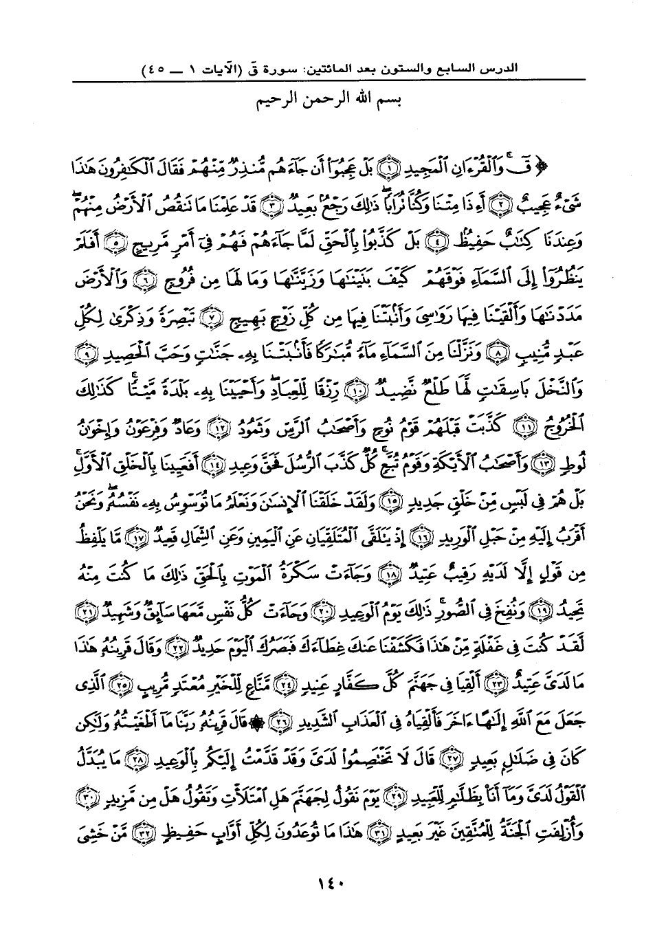 {ق وَالْقُرْآنِ الْمَجِيدِ (1) بَلْ عَجِبُوا أَن جَاءهُمْ مُنذِرٌ مِّنْهُمْ فَقَالَ الْكَافِرُونَ هَذَا شَيْءٌ عَجِيبٌ (2) أَئِذَا مِتْنَا وَكُنَّا تُرَاباً ذَلِكَ رَجْعٌ بَعِيدٌ (3) قَدْ عَلِمْنَا مَا تَنقُصُ الْأَرْضُ مِنْهُمْ وَعِندَنَا كِتَابٌ حَفِيظٌ (4) بَلْ كَذَّبُوا بِالْحَقِّ لَمَّا جَاءهُمْ فَهُمْ فِي أَمْرٍ مَّرِيجٍ (5) أَفَلَمْ يَنظُرُوا إِلَى السَّمَاء فَوْقَهُمْ كَيْفَ بَنَيْنَاهَا وَزَيَّنَّاهَا وَمَا لَهَا مِن فُرُوجٍ (6) وَالْأَرْضَ مَدَدْنَاهَا وَأَلْقَيْنَا فِيهَا رَوَاسِيَ وَأَنبَتْنَا فِيهَا مِن كُلِّ زَوْجٍ بَهِيجٍ (7) تَبْصِرَةً وَذِكْرَى لِكُلِّ عَبْدٍ مُّنِيبٍ (8) وَنَزَّلْنَا مِنَ السَّمَاءِ مَاءً مُّبَارَكاً فَأَنبَتْنَا بِهِ