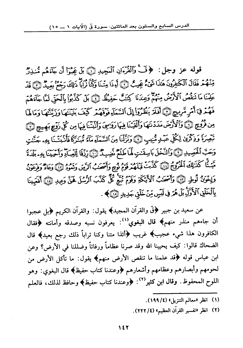 عن سعيد بن جبير: {ق وَالْقُرْآنِ الْمَجِيدِ} ، يقول: والقرآن الكريم، {بَلْ عَجِبُوا أَن جَاءهُمْ مُنذِرٌ مِّنْهُمْ} ، قال البغوي: يعرفون نسبه وصدقه وأمانته، {فَقَالَ الْكَافِرُونَ هَذَا شَيْءٌ عَجِيبٌ} غريب، {أَئِذَا مِتْنَا وَكُنَّا تُرَاباً ذَلِكَ رَجْعٌ بَعِيدٌ} ، قال الضحاك: قالوا: كيف يحيينا الله وقد صرنا عظامًا ورفاتًا وضللنا في الأرض؟ وعن ابن عباس قوله: {قَدْ عَلِمْنَا مَا تَنقُصُ الْأَرْضُ مِنْهُمْ} ، يقول: ما تأكل الأرض من لحومهم وأبصارهم وعظامهم وأشعارهم، {وَعِندَنَا كِتَابٌ حَفِيظٌ} قال البغوي: وهو اللوح المحفوظ. وقال ابن كثير: {وَعِندَنَا كِتَابٌ