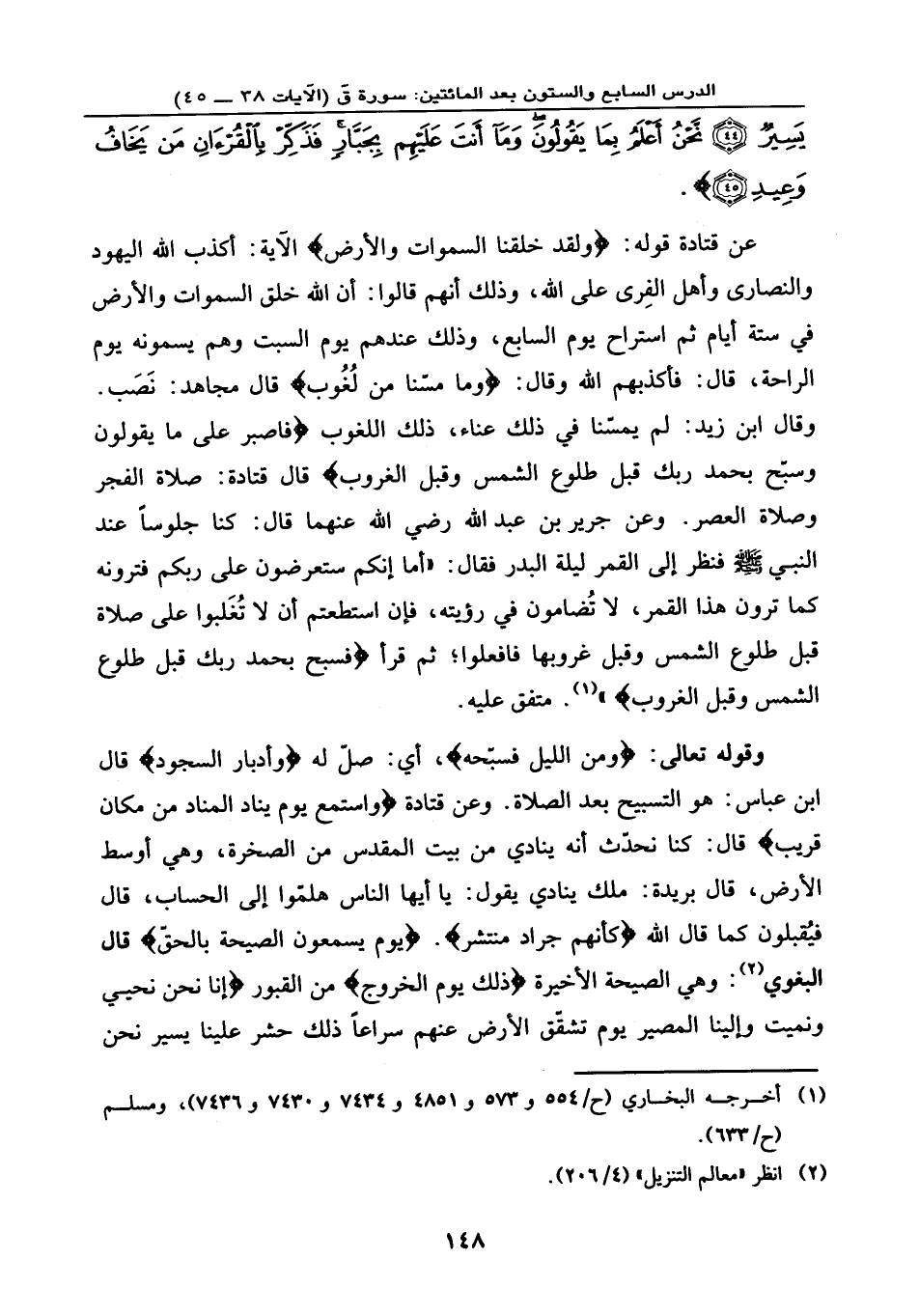 وقال ابن زيد: لم يمسنا في ذلك عناء، ذلك اللغوب {فَاصْبِرْ عَلَى مَا يَقُولُونَ وَسَبِّحْ بِحَمْدِ رَبِّكَ قَبْلَ طُلُوعِ الشَّمْسِ وَقَبْلَ الْغُرُوبِ} ، قال قتادة: صلاة الفجر، وصلاة العصر. وعن جرير بن عبد الله رضي الله عنهما قال: كنا جلوسًا عند النبي - صلى الله عليه وسلم - فنظر إلى القمر ليلة البدر فقال: «أما إنكم ستعرضون على ربكم فترونه كما ترون هذا القمر لا تضامون