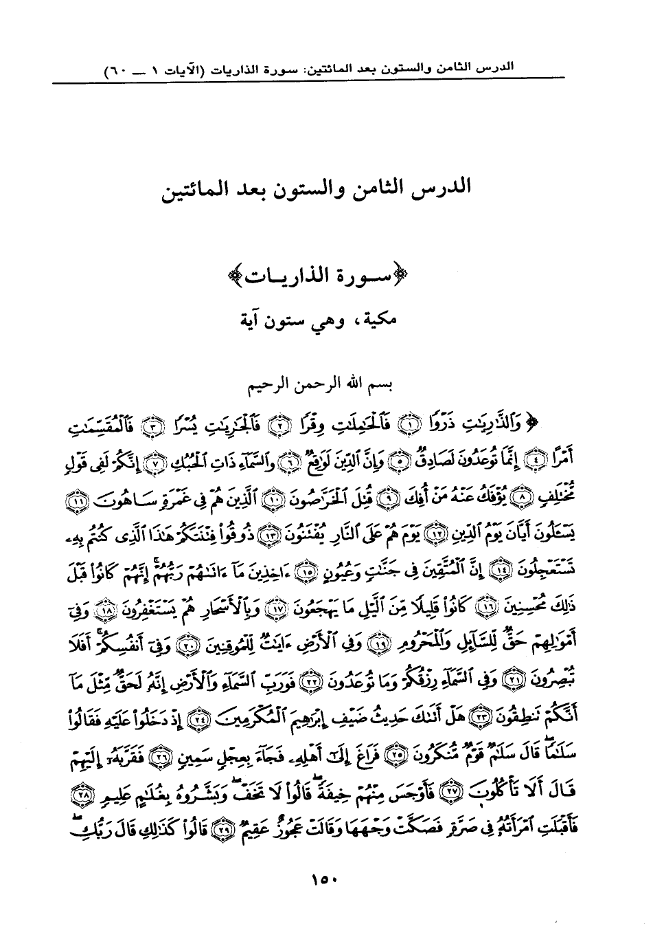 {وَالذَّارِيَاتِ ذَرْواً (1) فَالْحَامِلَاتِ وِقْراً (2) فَالْجَارِيَاتِ يُسْراً (3) فَالْمُقَسِّمَاتِ أَمْراً (4) إِنَّمَا تُوعَدُونَ لَصَادِقٌ (5) وَإِنَّ الدِّينَ لَوَاقِعٌ (6) وَالسَّمَاء ذَاتِ الْحُبُكِ (7) إِنَّكُمْ لَفِي قَوْلٍ مُّخْتَلِفٍ (8) يُؤْفَكُ عَنْهُ مَنْ أُفِكَ (9) قُتِلَ الْخَرَّاصُونَ (10) الَّذِينَ هُمْ فِي غَمْرَةٍ سَاهُونَ (11) يَسْأَلُونَ أَيَّانَ يَوْمُ الدِّينِ (12) يَوْمَ هُمْ عَلَى النَّارِ يُفْتَنُونَ (13) ذُوقُوا فِتْنَتَكُمْ هَذَا الَّذِي كُنتُم بِهِ تَسْتَعْجِلُونَ (14) إِنَّ الْمُتَّقِينَ فِي جَنَّاتٍ وَعُيُونٍ (15) آخِذِينَ مَا آتَاهُمْ رَبُّهُمْ إِنَّهُمْ كَانُوا قَبْلَ ذَلِكَ مُحْسِنِينَ (16) كَانُوا قَلِيلاً مِّنَ اللَّيْلِ مَا يَهْجَعُونَ (17) وَبِالْأَسْحَارِ هُمْ يَسْتَغْفِرُونَ (18) وَفِي أَمْوَالِهِمْ حَقٌّ لِّلسَّائِلِ وَالْمَحْرُومِ (19) وَفِي الْأَرْضِ آيَاتٌ لِّلْمُوقِنِينَ (20) وَفِي أَنفُسِكُمْ أَفَلَا تُبْصِرُونَ (21) وَفِي السَّمَاء رِزْقُكُمْ وَمَا تُوعَدُونَ (22) فَوَرَبِّ السَّمَاء وَالْأَرْضِ إِنَّهُ لَحَقٌّ مِّثْلَ مَا أَنَّكُمْ تَنطِقُونَ (23) هَلْ أَتَاكَ حَدِيثُ ضَيْفِ إِبْرَاهِيمَ الْمُكْرَمِينَ (24) إِذْ دَخَلُوا عَلَيْهِ فَقَالُوا سَلَاماً قَالَ سَلَامٌ قَوْمٌ مُّنكَرُونَ (25) فَرَاغَ إِلَى أَهْلِهِ فَجَاء بِعِجْلٍ سَمِينٍ (26) فَقَرَّبَهُ إِلَيْهِمْ قَالَ أَلَا تَأْكُلُونَ (27) فَأَوْجَسَ مِنْهُمْ خِيفَةً قَالُوا لَا تَخَفْ وَبَشَّرُوهُ بِغُلَامٍ عَلِيمٍ (28) فَأَقْبَلَتِ امْرَأَتُهُ فِي صَرَّةٍ فَصَكَّتْ وَجْهَهَا وَقَالَتْ عَجُوزٌ عَقِيمٌ (29) قَالُوا كَذَلِكَ