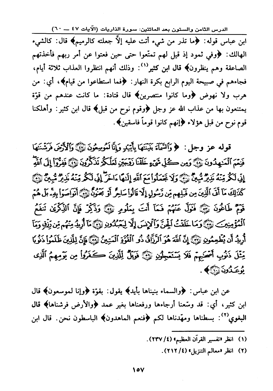 قوله عز وجل: {وَالسَّمَاء بَنَيْنَاهَا بِأَيْدٍ وَإِنَّا لَمُوسِعُونَ (47) وَالْأَرْضَ فَرَشْنَاهَا فَنِعْمَ الْمَاهِدُونَ (48) وَمِن كُلِّ شَيْءٍ خَلَقْنَا زَوْجَيْنِ لَعَلَّكُمْ تَذَكَّرُونَ (49) فَفِرُّوا إِلَى اللَّهِ إِنِّي لَكُم مِّنْهُ نَذِيرٌ مُّبِينٌ (50) وَلَا تَجْعَلُوا مَعَ اللَّهِ إِلَهاً آخَرَ إِنِّي لَكُم مِّنْهُ نَذِيرٌ مُّبِينٌ (51) كَذَلِكَ مَا أَتَى الَّذِينَ مِن قَبْلِهِم مِّن رَّسُولٍ إِلَّا قَالُوا سَاحِرٌ أَوْ مَجْنُونٌ (52) أَتَوَاصَوْا بِهِ بَلْ هُمْ قَوْمٌ طَاغُونَ (53) فَتَوَلَّ عَنْهُمْ فَمَا أَنتَ بِمَلُومٍ (54) وَذَكِّرْ فَإِنَّ الذِّكْرَى تَنفَعُ الْمُؤْمِنِينَ (55) وَمَا خَلَقْتُ الْجِنَّ وَالْإِنسَ إِلَّا لِيَعْبُدُونِ (56) مَا أُرِيدُ مِنْهُم مِّن رِّزْقٍ وَمَا أُرِيدُ أَن يُطْعِمُونِ (57) إِنَّ اللَّهَ هُوَ الرَّزَّاقُ ذُو الْقُوَّةِ الْمَتِينُ (58) فَإِنَّ لِلَّذِينَ ظَلَمُوا ذَنُوباً مِّثْلَ ذَنُوبِ أَصْحَابِهِمْ فَلَا يَسْتَعْجِلُونِ (59) فَوَيْلٌ لِّلَّذِينَ كَفَرُوا مِن يَوْمِهِمُ الَّذِي يُوعَدُونَ (60) } .
