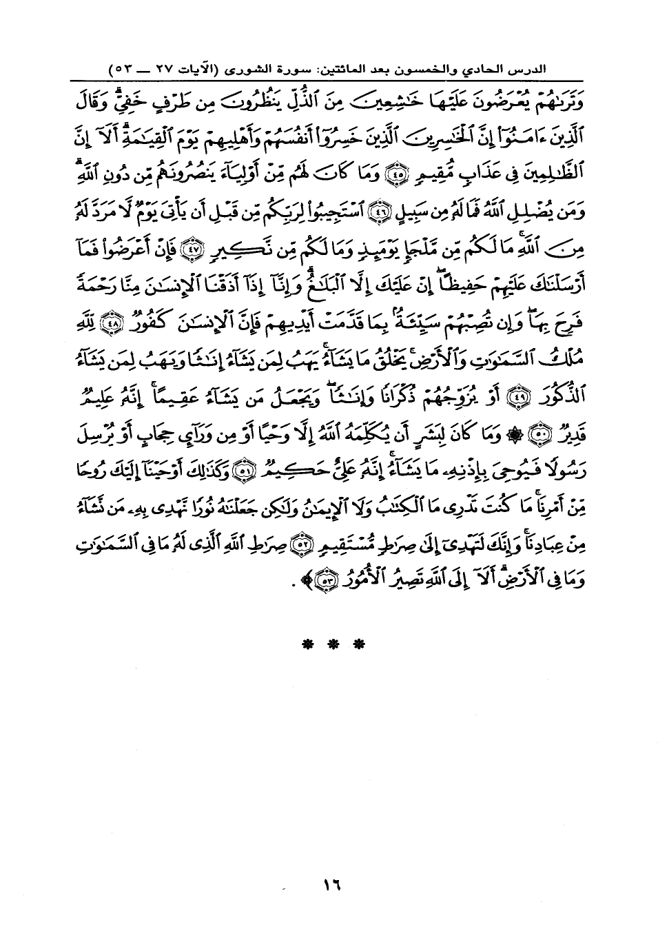 (42) وَلَمَن صَبَرَ وَغَفَرَ إِنَّ ذَلِكَ لَمِنْ عَزْمِ الْأُمُورِ (43) وَمَن يُضْلِلِ اللَّهُ فَمَا لَهُ مِن وَلِيٍّ مِّن بَعْدِهِ وَتَرَى الظَّالِمِينَ لَمَّا رَأَوُا الْعَذَابَ يَقُولُونَ هَلْ إِلَى مَرَدٍّ مِّن سَبِيلٍ (44) وَتَرَاهُمْ يُعْرَضُونَ عَلَيْهَا خَاشِعِينَ مِنَ الذُّلِّ يَنظُرُونَ مِن طَرْفٍ خَفِيٍّ وَقَالَ الَّذِينَ آمَنُوا إِنَّ الْخَاسِرِينَ الَّذِينَ خَسِرُوا أَنفُسَهُمْ وَأَهْلِيهِمْ يَوْمَ الْقِيَامَةِ أَلَا إِنَّ الظَّالِمِينَ فِي عَذَابٍ مُّقِيمٍ (45) وَمَا كَانَ لَهُم مِّنْ أَوْلِيَاء يَنصُرُونَهُم مِّن دُونِ اللَّهِ وَمَن يُضْلِلِ اللَّهُ فَمَا لَهُ مِن سَبِيلٍ (46) اسْتَجِيبُوا لِرَبِّكُم مِّن قَبْلِ أَن يَأْتِيَ يَوْمٌ لَّا مَرَدَّ لَهُ مِنَ اللَّهِ مَا لَكُم مِّن مَّلْجَأٍ يَوْمَئِذٍ وَمَا لَكُم مِّن نَّكِيرٍ (47) فَإِنْ أَعْرَضُوا فَمَا أَرْسَلْنَاكَ عَلَيْهِمْ حَفِيظاً إِنْ عَلَيْكَ إِلَّا الْبَلَاغُ وَإِنَّا إِذَا أَذَقْنَا الْإِنسَانَ مِنَّا رَحْمَةً فَرِحَ بِهَا وَإِن تُصِبْهُمْ سَيِّئَةٌ بِمَا قَدَّمَتْ أَيْدِيهِمْ فَإِنَّ الْإِنسَانَ كَفُورٌ (48) لِلَّهِ مُلْكُ السَّمَاوَاتِ وَالْأَرْضِ يَخْلُقُ مَا يَشَاءُ يَهَبُ لِمَنْ يَشَاءُ إِنَاثاً وَيَهَبُ لِمَن يَشَاءُ الذُّكُورَ (49) أَوْ يُزَوِّجُهُمْ ذُكْرَاناً وَإِنَاثاً وَيَجْعَلُ مَن يَشَاءُ عَقِيماً إِنَّهُ عَلِيمٌ قَدِيرٌ (50) وَمَا كَانَ لِبَشَرٍ أَن يُكَلِّمَهُ اللَّهُ إِلَّا وَحْياً أَوْ مِن وَرَاء حِجَابٍ أَوْ يُرْسِلَ رَسُولاً فَيُوحِيَ بِإِذْنِهِ مَا يَشَاءُ إِنَّهُ عَلِيٌّ حَكِيمٌ (51) وَكَذَلِكَ أَوْحَيْنَا إِلَيْكَ رُوحاً مِّنْ أَمْرِنَا مَا كُنتَ تَدْرِي مَا الْكِتَابُ وَلَا الْإِيمَانُ وَلَكِن جَعَلْنَاهُ نُوراً نَّهْدِي بِهِ مَنْ نَّشَاء مِنْ عِبَادِنَا وَإِنَّكَ لَتَهْدِي إِلَى صِرَاطٍ مُّسْتَقِيمٍ (52) صِرَاطِ اللَّهِ الَّذِي لَهُ مَا فِي السَّمَاوَاتِ وَمَا فِي الْأَرْضِ أَلَا إِلَى اللَّهِ تَصِيرُ الأمُورُ (53) } .