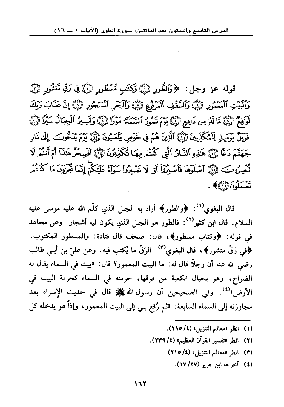 قال البغوي: {وَالطُّورِ} أراد به الجبل الذي كَلَّم الله عليه موسى عليه السلام. قال ابن كثير: فالطور هو الجبل الذي يكون فيه أشجار. وعن مجاهد في قوله: {وَكِتَابٍ مَّسْطُورٍ} ، قال: صحف. قال قتادة: والمسطور: المكتوب. {فِي رَقٍّ مَّنشُورٍ} . قال البغوي: الرَقّ ما يُكتب فيه. وعن عليّ بن أبي طالب رضي الله عنه أنّ رجلاً قال له: ما البيت المعمور؟ قال: (بيت في السماء يقال له: الضراح، وهو بحيال الكعبة من فوقها، حرمته في السماء كحرمة البيت في الأرض) . وفي الصحيحين أن رسول الله - صلى الله عليه وسلم - قال في حديث الإسراء بعد مجاوزته إلى السماء السابعة: «ثم رُفع بي إلى البيت المعمور، وإذًا هو يدخله كل