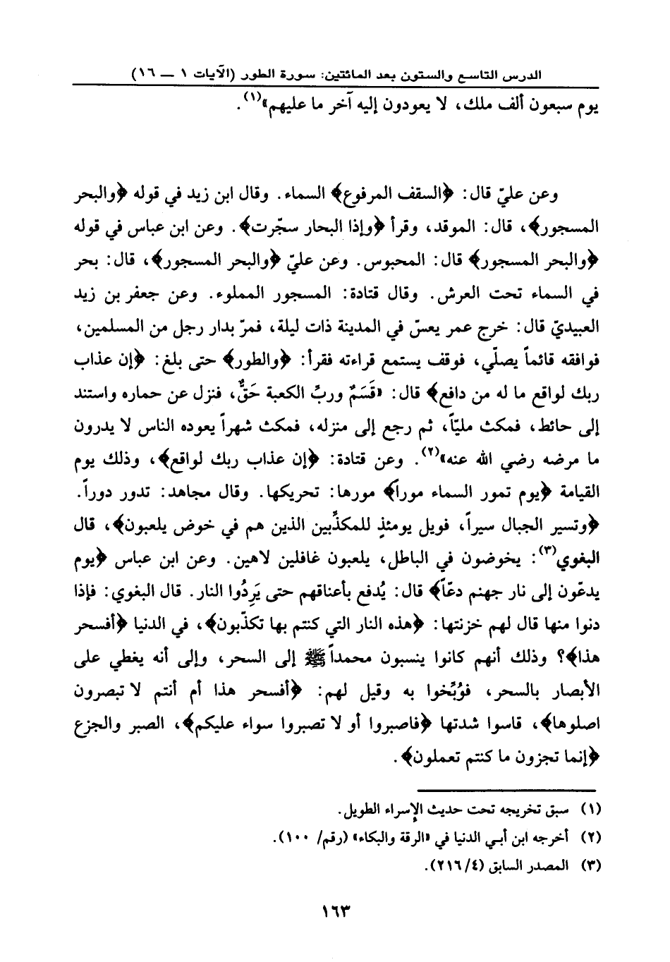 وعن ابن عباس في قوله: {وَالْبَحْرِ الْمَسْجُورِ} ، قال: المحبوس. وعن علي: {وَالْبَحْرِ الْمَسْجُورِ} ، قال: بحر في السماء تحت العرش. وقال قتادة: المسجور المملوء. وعن جعفر بن زيد العبيدي قال: خرج عمر يعسّ في المدينة ذات ليلة، فمر بدار رجل من المسلمين، فوافقه قائمًا يصلي فوقف يستمع قراءته فقرأ: {وَالطُّورِ} حتى بلغ: {إِنَّ عَذَابَ رَبِّكَ لَوَاقِعٌ * مَا لَهُ مِن دَافِعٍ} ، قال: (قسم وربِّ الكعبة حق، فنزل عن حماره واستند إلى حائط فمكث مليًا، ثم رجع إلى منزله، فمكث شهرًا يعوده الناس لا يدرون ما مرضه رضي الله عنه) . وعن قتادة: {إِنَّ عَذَابَ رَبِّكَ لَوَاقِعٌ} ، وذلك يوم القيامة {يَوْمَ تَمُورُ السَّمَاء مَوْراً} مورها: تحريكها. وقال مجاهد: تدور دورًا. {وَتَسِيرُ الْجِبَالُ سَيْراً * فَوَيْلٌ يَوْمَئِذٍ لِلْمُكَذِّبِينَ * الَّذِينَ هُمْ فِي خَوْضٍ يَلْعَبُونَ} ، قال البغوي: يخوضون في الباطل يلعبون غافلين لاهين. وعن ابن عباس: {يَوْمَ يُدَعُّونَ إِلَى نَارِ جَهَنَّمَ دَعّاً} ، قال: يُدفع بأعناقهم حتى يردوا النار. قال البغوي: فإذا دنوا منها قال لهم خزنتها: {هَذِهِ النَّارُ الَّتِي كُنتُم بِهَا تُكَذِّبُونَ} ، في الدنيا {أَفَسِحْرٌ هَذَا} ؟ وذلك أنهم كانوا ينسبون محمدًا - صلى الله عليه وسلم - إلى السحر، وإلى أنه يغطي على الأبصار بالسحر فَوُبِّخوا به وقيل لهم: {أَفَسِحْرٌ هَذَا أَمْ أَنْتُمْ لا تُبْصِرُونَ} . {اصْلَوْهَا} قاسوا شدتها {فَاصْبِرُوا أَوْ لا تَصْبِرُوا سَوَاءٌ عَلَيْكُمْ} ، الصبر والجزع، {إِنَّمَا تُجْزَوْنَ مَا كُنْتُمْ تَعْمَلُونَ} .