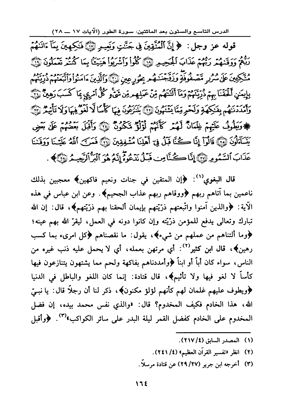 قال البغوي: {إِنَّ الْمُتَّقِينَ فِي جَنَّاتٍ وَنَعِيمٍ * فَاكِهِينَ} ، معجبين بذلك ناعمين بما آتاهم ربهم، {وَوَقَاهُمْ رَبُّهُمْ عَذَابَ الْجَحِيمِ} . وعن ابن عباس في هذه الآية: {وَالَّذِينَ آمَنُوا وَاتَّبَعَتْهُمْ ذُرِّيَّتُهُم بِإِيمَانٍ أَلْحَقْنَا بِهِمْ ذُرِّيَّتَهُمْ} ، قال: إن الله تبارك وتعالى يدفع للمؤمن ذريته وإن كانوا دونه في العمل، ليقر الله بهم عينه؛ {وَمَا أَلَتْنَاهُم مِّنْ عَمَلِهِم مِّن شَيْءٍ} ، يقول: ما نقصناهم، {كُلُّ امْرِئٍ بِمَا كَسَبَ رَهِينٌ} ، قال ابن كثير: أي: مرتهن بعمله، أي: لا يحمل عليه ذنب غيره من الناس سواء كان أبا أو ابنًا، {وَأَمْدَدْنَاهُم بِفَاكِهَةٍ وَلَحْمٍ مِّمَّا يَشْتَهُونَ * يَتَنَازَعُونَ فِيهَا كَأْساً لَّا لَغْوٌ فِيهَا وَلَا تَأْثِيمٌ} ، قال قتادة: إنما كان اللغو والباطل في الدنيا، {وَيَطُوفُ عَلَيْهِمْ غِلْمَانٌ لَّهُمْ كَأَنَّهُمْ لُؤْلُؤٌ مَّكْنُونٌ}