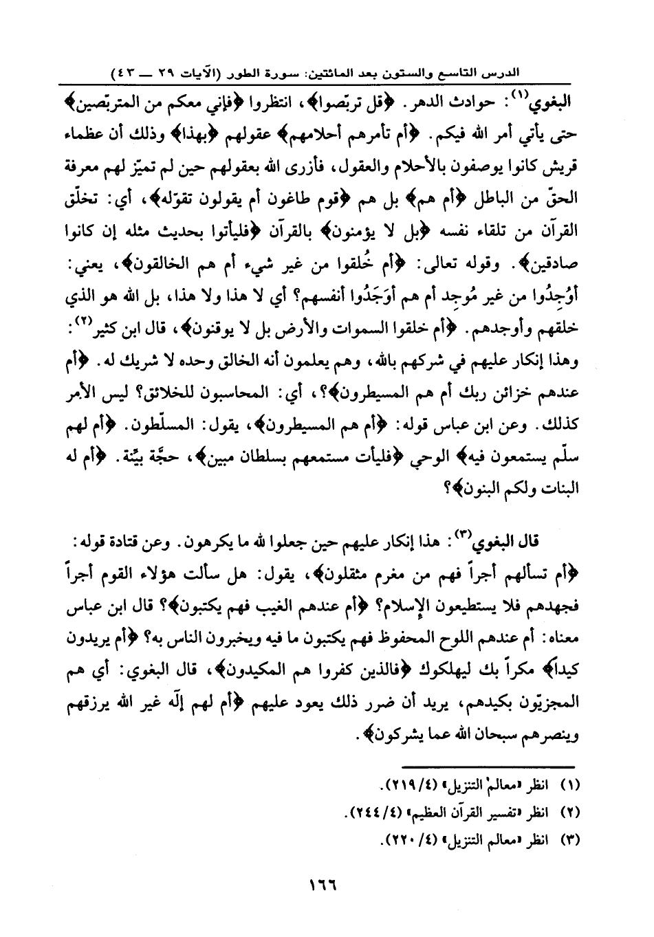 البغوي: حوادث الدهر. {قُلْ تَرَبَّصُوا} ، انتظروا {فَإِنِّي مَعَكُم مِّنَ الْمُتَرَبِّصِينَ} حتى يأتي أمر الله فيكم. {أَمْ تَأْمُرُهُمْ أَحْلَامُهُم} ، عقولهم، {بِهَذَا} ، وذلك أن عظماء قريش كانوا يوصفون بالأحلام والعقول، فأزرى الله بعقولهم حين لم تميز لهم معرفة الحق من الباطل، {أَمْ هُمْ} بَلْ هُمْ: {قَوْمٌ طَاغُونَ * أَمْ يَقُولُونَ تَقَوَّلَهُ} ، أي: تخلق القرآن من تلقاء نفسه {بَل لَّا يُؤْمِنُونَ} بالقرآن {فَلْيَأْتُوا بِحَدِيثٍ مِّثْلِهِ إِن كَانُوا صَادِقِينَ} . وقوله تعالى: {أَمْ خُلِقُوا مِنْ غَيْرِ شَيْءٍ أَمْ هُمُ الْخَالِقُونَ} ، يعني: أُوجِدُوا من غير مُوجِد أم هم أَوجَدُوا أنفسهم؟ أي: لا هذا ولا هذا، بل الله هو الذي خلقهم وأوجدهم. {أَمْ خَلَقُوا السَّمَاوَاتِ وَالْأَرْضَ بَل لَّا يُوقِنُونَ} ، قال ابن كثير: وهذا إنكار عليهم في شركهم بالله، وهم يعلمون أنه الخالق وحده لا شريك له. {أَمْ عِندَهُمْ خَزَائِنُ رَبِّكَ أَمْ هُمُ الْمُصَيْطِرُونَ} ؟ أي: المحاسبون للخلائق؟ ليس الأمر كذلك. وعن ابن عباس: قوله: {أم هم المسيطرون} ، يقول: المسلطون. {أَمْ