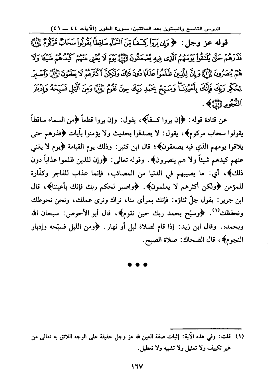 قوله عز وجل: {وَإِن يَرَوْا كِسْفاً مِّنَ السَّمَاءِ سَاقِطاً يَقُولُوا سَحَابٌ مَّرْكُومٌ (44) فَذَرْهُمْ حَتَّى يُلَاقُوا يَوْمَهُمُ الَّذِي فِيهِ يُصْعَقُونَ (45) يَوْمَ لَا يُغْنِي عَنْهُمْ كَيْدُهُمْ شَيْئاً وَلَا هُمْ يُنصَرُونَ (46) وَإِنَّ لِلَّذِينَ ظَلَمُوا عَذَاباً دُونَ ذَلِكَ وَلَكِنَّ أَكْثَرَهُمْ لَا يَعْلَمُونَ (47) وَاصْبِرْ لِحُكْمِ رَبِّكَ فَإِنَّكَ بِأَعْيُنِنَا وَسَبِّحْ بِحَمْدِ رَبِّكَ حِينَ تَقُومُ (48) وَمِنَ اللَّيْلِ فَسَبِّحْهُ وَإِدْبَارَ النُّجُومِ (49) } .