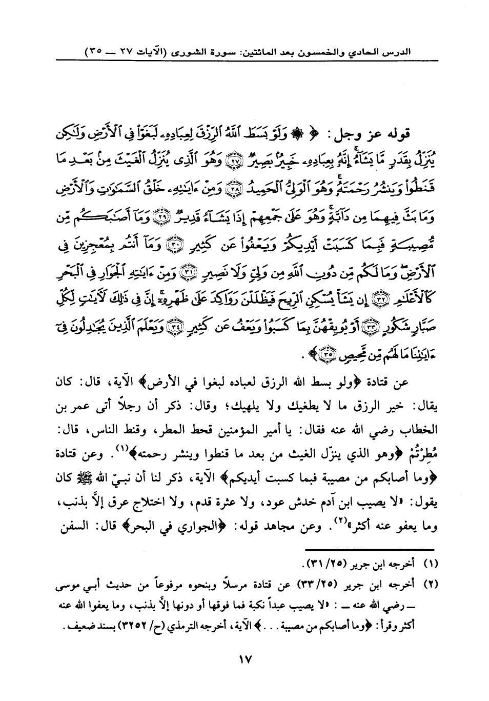 عن قتادة: {وَلَوْ بَسَطَ اللَّهُ الرِّزْقَ لِعِبَادِهِ لَبَغَوْا فِي الْأَرْضِ} الآية، قال: كان يقال: خير الرزق ما لا يطغيك ولا يلهيك؛ وقال: ذكر أن رجلاً أتى عمر بن الخطاب رضي الله عنه فقال: يا أمير المؤمنين قحط المطر، وقنط الناس، قال: مطرتم {وَهُوَ الَّذِي يُنَزِّلُ الْغَيْثَ مِن بَعْدِ مَا قَنَطُوا وَيَنشُرُ رَحْمَتَهُ} . وعن قتادة: {وَمَا أَصَابَكُم مِّن مُّصِيبَةٍ فَبِمَا كَسَبَتْ أَيْدِيكُمْ} الآية، ذكر لنا أن نبي الله - صلى الله عليه وسلم - كان يقول: «لا يصيب ابن آدم خدش عود، ولا عثرة قدم، ولا اختلاج عرق إلا بذنب وما يعفو عنه أكثر» . وعن مجاهد قوله: {الْجَوَارِ فِي الْبَحْرِ} ، قال: السفن