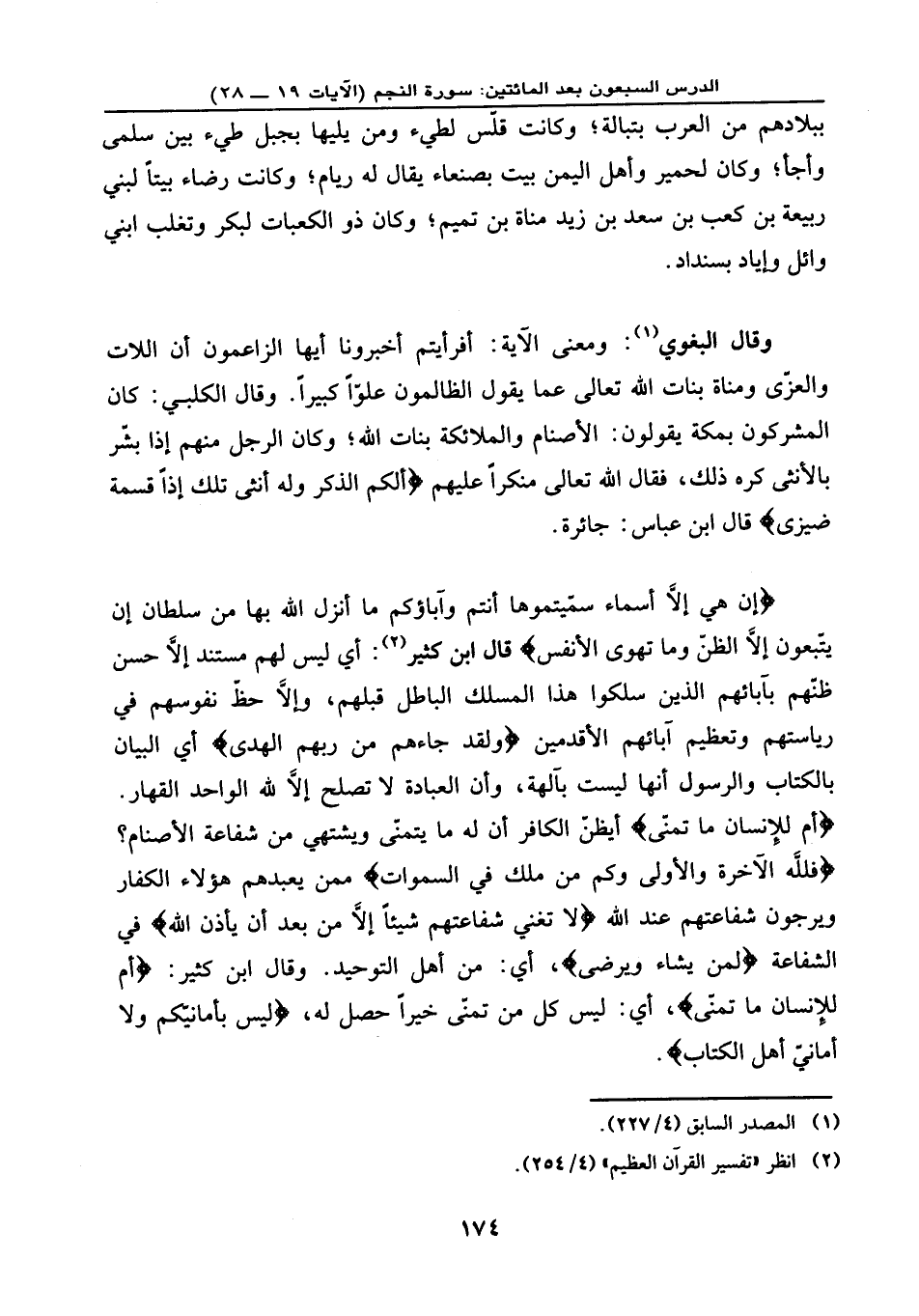 {إِنْ هِيَ إِلَّا أَسْمَاء سَمَّيْتُمُوهَا أَنتُمْ وَآبَاؤُكُم مَّا أَنزَلَ اللَّهُ بِهَا مِن سُلْطَانٍ إِن يَتَّبِعُونَ إِلَّا الظَّنَّ وَمَا تَهْوَى الْأَنفُسُ} ، قال ابن كثير: أي: ليس لهم مستند إلا حسن ظنهم بآبائهم الذين سلكوا هذا المسلك الباطل قبلهم، وإلا حظ نفوسهم في رياستهم وتعظيم آبائهم الأقدمين، {وَلَقَدْ جَاءهُم مِّن رَّبِّهِمُ الْهُدَى} ، أي: البيان بالكتاب والرسول أنها ليست بآلهة وأن العبادة لا تصلح إلا لله الواحد القهار. {أَمْ لِلْإِنسَانِ مَا تَمَنَّى} أيظن الكافر أن له ما يتمنى ويشتهي من شفاعة الأصنام؟ {فَلِلَّهِ الْآخِرَةُ