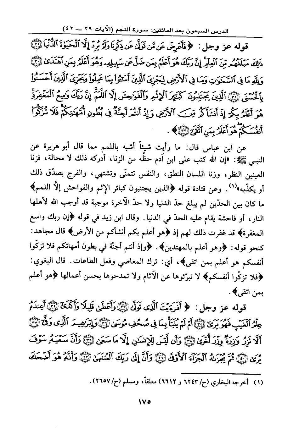 عن ابن عباس قال: ما رأيت شيئًا أشبه باللمم مما قال أبو هريرة عن النبي - صلى الله عليه وسلم -: «إن الله كتب على ابن آدم حظه من الزنا أدركه ذلك لا محالة، فزنا العينين النظر، وزنا اللسان النطق، والنفس تتمنى وتشتهي، والفرج يصدق ذلك أو يكذبه» . وعن قتادة: قوله: {الَّذِينَ يَجْتَنِبُونَ كَبَائِرَ الْإِثْمِ وَالْفَوَاحِشَ إِلَّا اللَّمَمَ} ، ما كان بين الحدّين لم يبلغ حدّ الدنيا ولا حدّ الآخرة موجبة، قد أوجب الله لأهلها النار، أو فاحشة يقام عليه الحدّ في الدنيا. وقال ابن زيد في قوله: {إِنَّ رَبَّكَ وَاسِعُ الْمَغْفِرَةِ} ، قد غفرت ذلك لهم إذ {هُوَ أَعْلَمُ بِكُمْ إِذْ أَنشَأَكُم مِّنَ الْأَرْضِ} ، قال