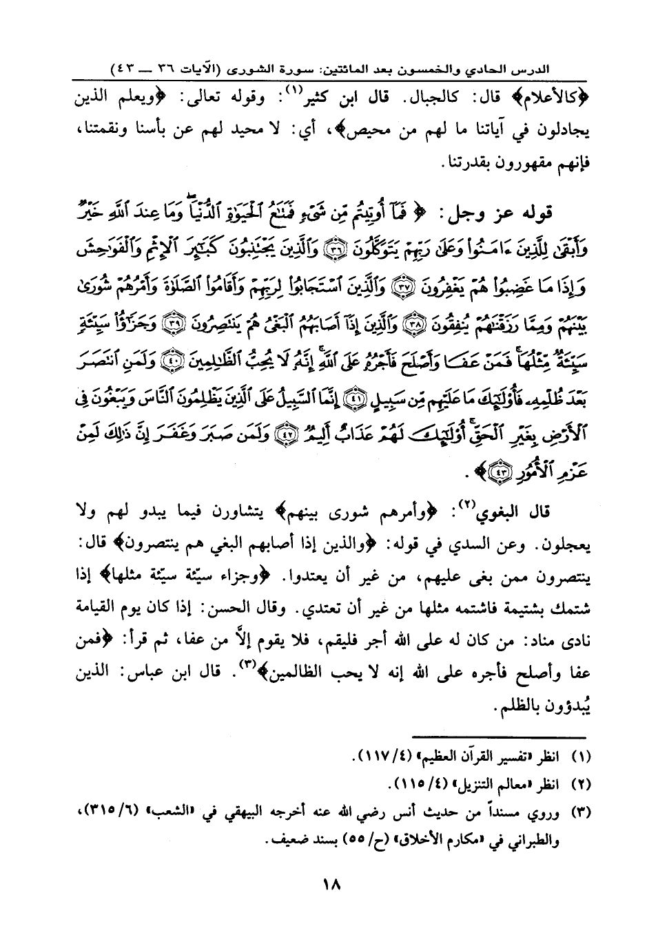 قال البغوي: {وَأَمْرُهُمْ شُورَى بَيْنَهُمْ} يتشاورن فيما يبدو لهم ولا يعجلون. وعن السدي في قوله: {وَالَّذِينَ إِذَا أَصَابَهُمُ الْبَغْيُ هُمْ يَنتَصِرُونَ} ، قال: ينتصرون ممن بغى عليهم، من غير أن يعتدوا. ... {وَجَزَاء سَيِّئَةٍ سَيِّئَةٌ مِّثْلُهَا} إذا شتمك بشتيمه فاشتمه مثلها من غير أن تعتدي. وقال الحسن: إذا كان يوم القيامة نادى مناد: من كان له على الله أجر فليقم، فلا يقوم إلا من عفا، ثم قرأ: {فَمَنْ عَفَا وَأَصْلَحَ فَأَجْرُهُ عَلَى اللَّهِ إِنَّهُ لَا يُحِبُّ الظَّالِمِينَ} . قال ابن عباس: الذين يبدؤون بالظلم.
