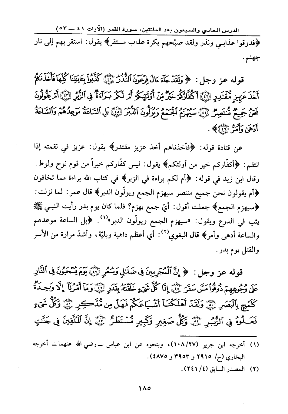 قوله عز وجل: {وَلَقَدْ جَاء آلَ فِرْعَوْنَ النُّذُرُ (41) كَذَّبُوا بِآيَاتِنَا كُلِّهَا فَأَخَذْنَاهُمْ أَخْذَ عَزِيزٍ مُّقْتَدِرٍ (42) أَكُفَّارُكُمْ خَيْرٌ مِّنْ أُوْلَئِكُمْ أَمْ لَكُم بَرَاءةٌ فِي الزُّبُرِ (43) أَمْ يَقُولُونَ نَحْنُ جَمِيعٌ مُّنتَصِرٌ (44) سَيُهْزَمُ الْجَمْعُ وَيُوَلُّونَ الدُّبُرَ (45) بَلِ السَّاعَةُ مَوْعِدُهُمْ وَالسَّاعَةُ أَدْهَى وَأَمَرُّ (46) } .