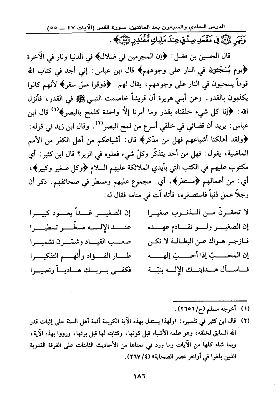 قال الحسين بن فضل: {إِنَّ الْمُجْرِمِينَ فِي ضَلَالٍ} ، في الدنيا ونار في الآخرة، {يَوْمَ يُسْحَبُونَ فِي النَّارِ عَلَى وُجُوهِهِمْ} ، قال ابن عباس: إني أجد في كتاب الله قومًا يسحبون في النار على وجوههم، يقال لهم: {ذُوقُوا مَسَّ سَقَرَ} ، لأنهم كانوا يكذبون بالقدر. وعن أبي هريرة أن قريشًا خاصمت النبي - صلى الله عليه وسلم - في القدر، فأنزل الله: {إِنَّا كُلَّ شَيْءٍ خَلَقْنَاهُ بِقَدَرٍ * وَمَا أَمْرُنَا إِلَّا وَاحِدَةٌ كَلَمْحٍ بِالْبَصَرِ} ، قال ابن عباس: يريد أن قضائي في خلقي أسرع من لمح البصر. وقال ابن زيد في قوله: {وَلَقَدْ أَهْلَكْنَا أَشْيَاعَكُمْ فَهَلْ مِن مُّدَّكِرٍ} ، قال: أشياعكم من أهل الكفر من الأمم الماضية، يقول: فهل من أحد يتذكّر وكلّ شيء فعلوه في الزبر؟ قال ابن كثير: أي: مكتوب عليهم في الكتب التي بأيدي الملائكة عليهم السلام {وَكُلُّ صَغِيرٍ وَكَبِيرٍ} أي: من أعمالهم، {مُسْتَطَرٌ} أي: مجموع عليهم ومسطر في صحائفهم. ذكر أن رجلاً عمل ذنبًا فاستصغره، فأتاه آت في منامه فقال له: