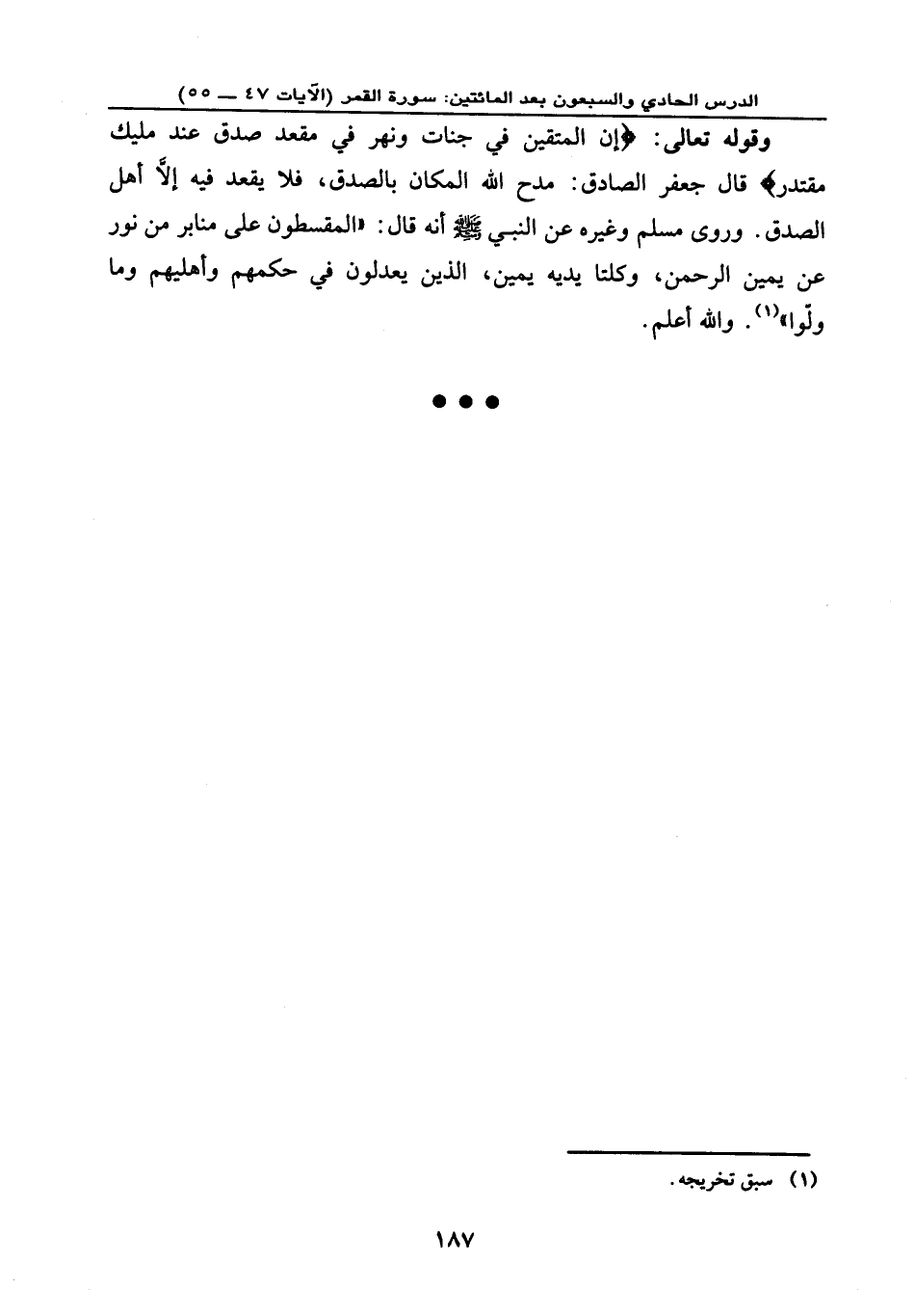 وقوله تعالى: {إِنَّ الْمُتَّقِينَ فِي جَنَّاتٍ وَنَهَرٍ * فِي مَقْعَدِ صِدْقٍ عِندَ مَلِيكٍ مُّقْتَدِرٍ} ، قال جعفر الصادق: مدح الله المكان بالصدق، فلا يقعد فيه إلا أهل الصدق. وروى مسلم وغيره عن النبي - صلى الله عليه وسلم - أنه قال: «المقسطون على منابر من نور عن يمين الرحمن، وكلتا يديه يمين، الذين يعدلون في حكمهم وأهليهم وما ولّوا» . والله أعلم.