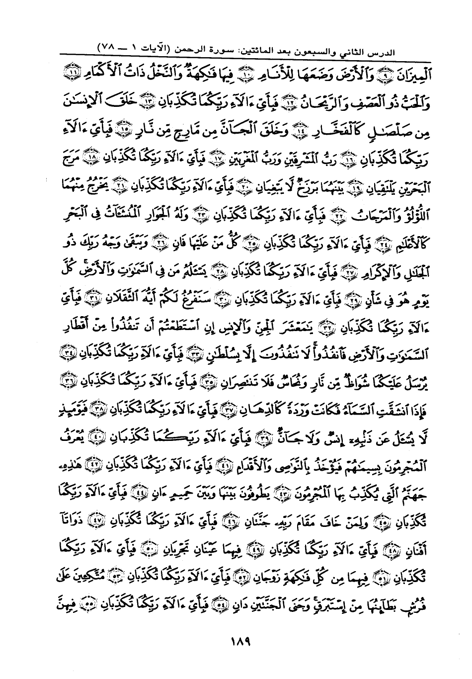 الْمِيزَانَ (9) وَالْأَرْضَ وَضَعَهَا لِلْأَنَامِ (10) فِيهَا فَاكِهَةٌ وَالنَّخْلُ ذَاتُ الْأَكْمَامِ (11) وَالْحَبُّ ذُو الْعَصْفِ وَالرَّيْحَانُ (12) فَبِأَيِّ آلَاء رَبِّكُمَا تُكَذِّبَانِ (13) خَلَقَ الْإِنسَانَ مِن صَلْصَالٍ كَالْفَخَّارِ (14) وَخَلَقَ الْجَانَّ مِن مَّارِجٍ مِّن نَّارٍ (15) فَبِأَيِّ آلَاء رَبِّكُمَا تُكَذِّبَانِ (16) رَبُّ الْمَشْرِقَيْنِ وَرَبُّ الْمَغْرِبَيْنِ (17) فَبِأَيِّ آلَاء رَبِّكُمَا تُكَذِّبَانِ (18) مَرَجَ الْبَحْرَيْنِ يَلْتَقِيَانِ (19) بَيْنَهُمَا بَرْزَخٌ لَّا يَبْغِيَانِ