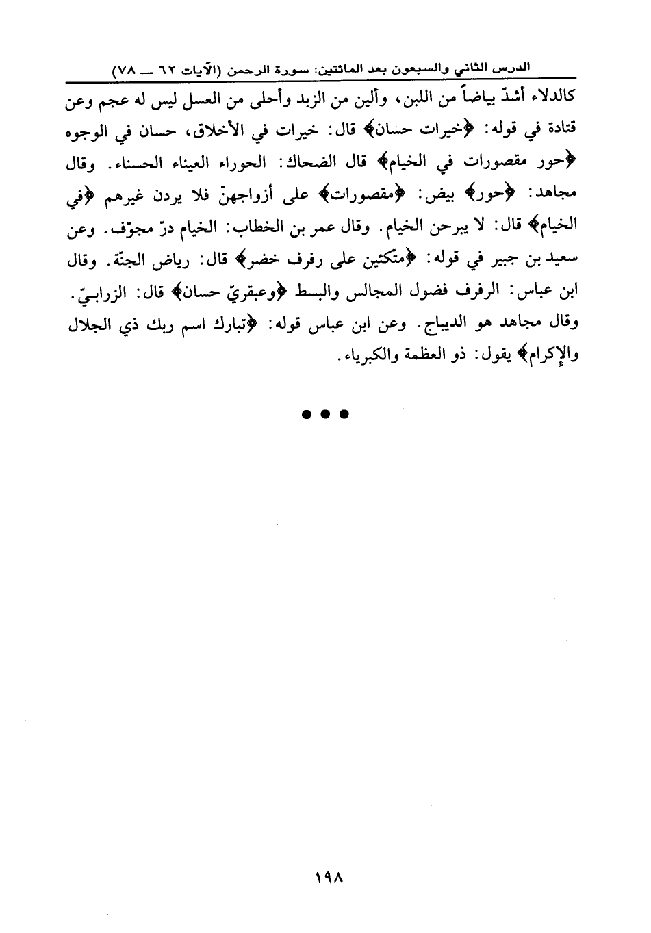 على أزواجهنّ فلا يردن غيرهم {فِي الْخِيَامِ} قال: لا يبرحن الخيام. وقال عمر بن الخطاب: الخيام درّ مجوّف. وعن سعيد بن جبير في قوله: {مُتَّكِئِينَ عَلَى رَفْرَفٍ خُضْرٍ} ، قال: رياض الجنّة. وقال ابن عباس الرفرف فضول المجالس والبسط {وَعَبْقَرِيٍّ حِسَانٍ} ، قال: الزرابيّ. وقال مجاهد: هو الديباج. وعن ابن عباس: قوله: {تَبَارَكَ اسْمُ رَبِّكَ ذِي الْجَلَالِ وَالْإِكْرَامِ} ، يقول: ذو العظمة والكبرياء.
