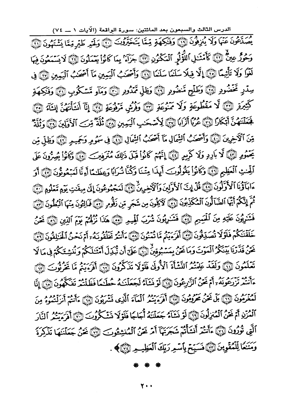 يَعْمَلُونَ (24) لا يَسْمَعُونَ فِيهَا لَغْواً وَلَا تَأْثِيماً (25) إِلَّا قِيلاً سَلَاماً سَلَاماً (26) وَأَصْحَابُ الْيَمِينِ مَا أَصْحَابُ الْيَمِينِ (27) فِي سِدْرٍ مَّخْضُودٍ (28) وَطَلْحٍ مَّنضُودٍ (29) وَظِلٍّ مَّمْدُودٍ (30) وَمَاء مَّسْكُوبٍ (31) وَفَاكِهَةٍ كَثِيرَةٍ (32) لَّا مَقْطُوعَةٍ وَلَا مَمْنُوعَةٍ (33) وَفُرُشٍ مَّرْفُوعَةٍ (34) إِنَّا أَنشَأْنَاهُنَّ إِنشَاء (35) فَجَعَلْنَاهُنَّ أَبْكَاراً (36) عُرُباً أَتْرَاباً (37) لِّأَصْحَابِ الْيَمِينِ (38) ثُلَّةٌ مِّنَ الْأَوَّلِينَ (39) وَثُلَّةٌ مِّنَ الْآخِرِينَ (40) وَأَصْحَابُ الشِّمَالِ مَا أَصْحَابُ الشِّمَالِ (41) فِي سَمُومٍ وَحَمِيمٍ (42) وَظِلٍّ مِّن يَحْمُومٍ (43) لَّا بَارِدٍ وَلَا كَرِيمٍ (44) إِنَّهُمْ كَانُوا قَبْلَ ذَلِكَ مُتْرَفِينَ (45) وَكَانُوا يُصِرُّونَ عَلَى الْحِنثِ الْعَظِيمِ (46) وَكَانُوا يَقُولُونَ أَئِذَا مِتْنَا وَكُنَّا تُرَاباً وَعِظَاماً أَئِنَّا لَمَبْعُوثُونَ (47) أَوَ آبَاؤُنَا الْأَوَّلُونَ (48) قُلْ إِنَّ الْأَوَّلِينَ وَالْآخِرِينَ (49) لَمَجْمُوعُونَ إِلَى مِيقَاتِ يَوْمٍ مَّعْلُومٍ (50) ثُمَّ إِنَّكُمْ أَيُّهَا الضَّالُّونَ الْمُكَذِّبُونَ (51) لآكِلُونَ مِن شَجَرٍ مِّن زَقُّومٍ (52) فَمَالِؤُونَ مِنْهَا الْبُطُونَ (53) فَشَارِبُونَ عَلَيْهِ مِنَ الْحَمِيمِ (54) فَشَارِبُونَ شُرْبَ الْهِيمِ (55) هَذَا نُزُلُهُمْ يَوْمَ الدِّينِ (56) نَحْنُ خَلَقْنَاكُمْ فَلَوْلَا تُصَدِّقُونَ (57) أَفَرَأَيْتُم مَّا تُمْنُونَ (58) أَأَنتُمْ تَخْلُقُونَهُ أَمْ نَحْنُ الْخَالِقُونَ (59) نَحْنُ قَدَّرْنَا بَيْنَكُمُ الْمَوْتَ وَمَا نَحْنُ بِمَسْبُوقِينَ (60) عَلَى أَن نُّبَدِّلَ أَمْثَالَكُمْ وَنُنشِئَكُمْ فِي مَا لَا تَعْلَمُونَ (61) وَلَقَدْ عَلِمْتُمُ النَّشْأَةَ الْأُولَى فَلَوْلا تَذكَّرُونَ (62) أَفَرَأَيْتُم مَّا تَحْرُثُونَ (63) أَأَنتُمْ تَزْرَعُونَهُ أَمْ نَحْنُ الزَّارِعُونَ (64) لَوْ نَشَاء لَجَعَلْنَاهُ حُطَاماً فَظَلْتُمْ تَفَكَّهُونَ (65) إِنَّا