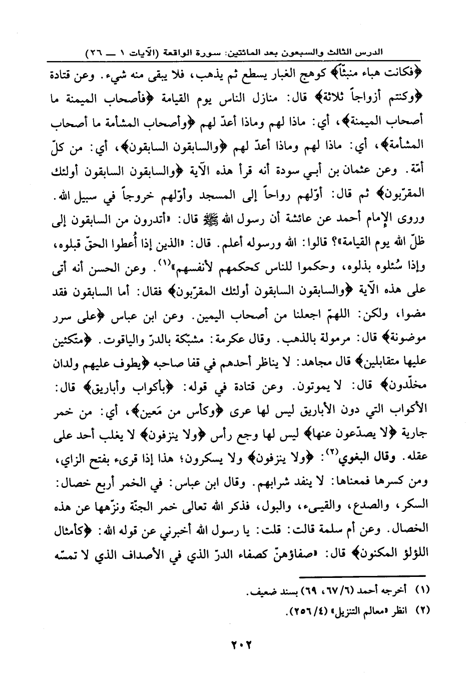 هَبَاء مُّنبَثّاً} قال: شعاع الشمس يدخل من الكوّة ليس بشيء. وعن عليّ رضي الله عنه في قوله: {فَكَانَتْ هَبَاء مُّنبَثّاً} ، كوهج الغبار يسطع ثم يذهب، فلا يبقى منه شيء. وعن قتادة: {وَكُنتُمْ أَزْوَاجاً ثَلَاثَةً} قال: منازل الناس يوم القيامة. {فَأَصْحَابُ الْمَيْمَنَةِ مَا أَصْحَابُ الْمَيْمَنَةِ} أي: ماذا لهم وماذا أعدّ لهم {وَأَصْحَابُ الْمَشْأَمَةِ مَا أَصْحَابُ الْمَشْأَمَةِ} أي: ماذا لهم وماذا أعدّ لهم {وَالسَّابِقُونَ السَّابِقُونَ} أي: من كلّ أمّة. وعن عثمان بن أبي سودة أنه قرأ هذه الآية: {وَالسَّابِقُونَ السَّابِقُونَ أُوْلَئِكَ الْمُقَرَّبُونَ} ثم قال: أوّلهم رواحًا إلى المسجد، وأوّلهم خروجًا في سبيل الله. وروى الإِمام أحمد عن عائشة أن رسول الله - صلى الله عليه وسلم - قال: «أتدرون من السابقون إلى ظلّ الله يوم القيامة» ؟ قالوا: الله ورسوله أعلم. قال: «الذين إذا أُعطوا الحقّ قبلوه، وإذا سُئلوه بذلوه، وحكموا للناس كحكمهم لأنفسهم» . وعن الحسن أنه أتى على هذه الآية: {وَالسَّابِقُونَ السَّابِقُونَ * أُوْلَئِكَ الْمُقَرَّبُونَ} ، فقال: أما السابقون فقد مضوا، ولكن اللهمّ اجعلنا من أصحاب اليمين. وعن ابن عباس: {عَلَى سُرُرٍ مَّوْضُونَةٍ} ، قال: مرمولة بالذهب. وقال عكرمة: مشبّكة بالدرّ والياقوت. {مُتَّكِئِينَ عَلَيْهَا مُتَقَابِلِينَ} قال مجاهد: لا يناظر أحدهم في قفا صاحبه. {يَطُوفُ عَلَيْهِمْ وِلْدَانٌ مُّخَلَّدُونَ} ، قال: لا يموتون. وعن قتادة في قوله: ... {بِأَكْوَابٍ وَأَبَارِيقَ} قال: الأكواب التي دون الأباريق ليس لها عرى، {وَكَأْسٍ مِّن مَّعِينٍ} أي: من خمر جارية {لا يُصَدَّعُونَ عَنْهَا} ليس