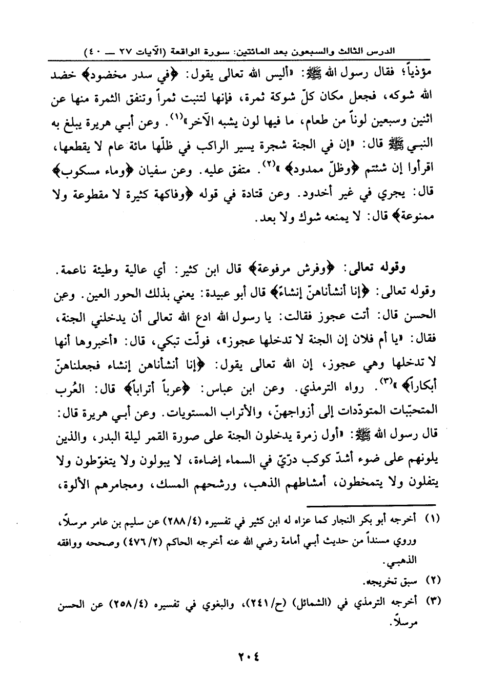 مؤذيًا؛ فقال رسول الله - صلى الله عليه وسلم -: «أليس الله تعالى يقول: {فِي سِدْرٍ مَّخْضُودٍ} خضد الله شوكه، فجعل مكان كلّ شوكة ثمرة فإنها لتنبت ثمرًا وتنفق الثمرة منها عن اثنين وسبعين لونًا من طعام، ما فيها لون يشبه الآخر» . وعن أبي هريرة يبلغ به النبي - صلى الله عليه وسلم - قال: «إن في الجنة شجرة يسير الراكب في ظلّها مائة عام لا يقطعها، اقرأوا إن شئتم: {وَظِلٍّ مَّمْدُودٍ} » . متفق عليه. وعن سفيان: {وَمَاء مَّسْكُوبٍ} قال: يجري في غير أخدود. وعن قتادة في قوله: {وَفَاكِهَةٍ كَثِيرَةٍ * لَّا مَقْطُوعَةٍ وَلَا مَمْنُوعَةٍ} ، قال: لا يمنعه شوك ولا بعد.