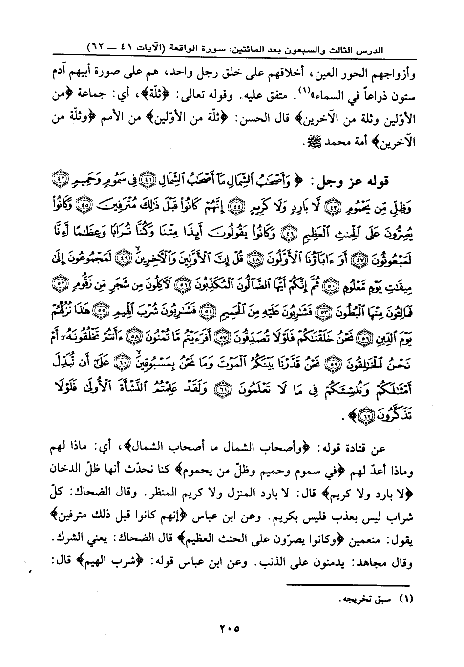 قوله عز وجل: {وَأَصْحَابُ الشِّمَالِ مَا أَصْحَابُ الشِّمَالِ (41) فِي سَمُومٍ وَحَمِيمٍ (42) وَظِلٍّ مِّن يَحْمُومٍ (43) لَّا بَارِدٍ وَلَا كَرِيمٍ (44) إِنَّهُمْ كَانُوا قَبْلَ ذَلِكَ مُتْرَفِينَ (45) وَكَانُوا يُصِرُّونَ عَلَى الْحِنثِ الْعَظِيمِ (46) وَكَانُوا يَقُولُونَ أَئِذَا مِتْنَا وَكُنَّا تُرَاباً وَعِظَاماً أَئِنَّا لَمَبْعُوثُونَ (47) أَوَ آبَاؤُنَا الْأَوَّلُونَ (48) قُلْ إِنَّ الْأَوَّلِينَ وَالْآخِرِينَ (49) لَمَجْمُوعُونَ إِلَى مِيقَاتِ يَوْمٍ مَّعْلُومٍ (50) ثُمَّ إِنَّكُمْ أَيُّهَا الضَّالُّونَ الْمُكَذِّبُونَ (51) لَآكِلُونَ مِن شَجَرٍ مِّن زَقُّومٍ (52) فَمَالِؤُونَ مِنْهَا الْبُطُونَ (53) فَشَارِبُونَ عَلَيْهِ مِنَ الْحَمِيمِ (54) فَشَارِبُونَ شُرْبَ الْهِيمِ (55) هَذَا نُزُلُهُمْ يَوْمَ الدِّينِ (56) نَحْنُ خَلَقْنَاكُمْ فَلَوْلَا تُصَدِّقُونَ