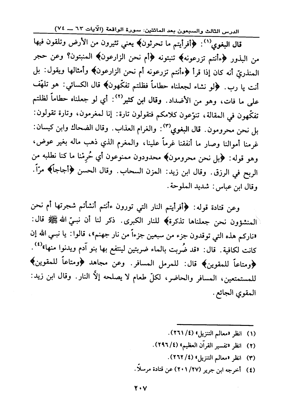 قال البغوي: {أَفَرَأَيْتُم مَّا تَحْرُثُونَ} ، يعني: تثيرون من الأرض وتلقون فيها من البذور، {أَأَنتُمْ تَزْرَعُونَهُ} تنبتونه {أَمْ نَحْنُ الزَّارِعُونَ} المنبتون؟ وعن حجر المنذريّ أنه كان إذا قرأ: {أَأَنتُمْ تَزْرَعُونَهُ أَمْ نَحْنُ الزَّارِعُونَ} وأمثالها ويقول: بل أنت يا رب. {لَوْ نَشَاء لَجَعَلْنَاهُ