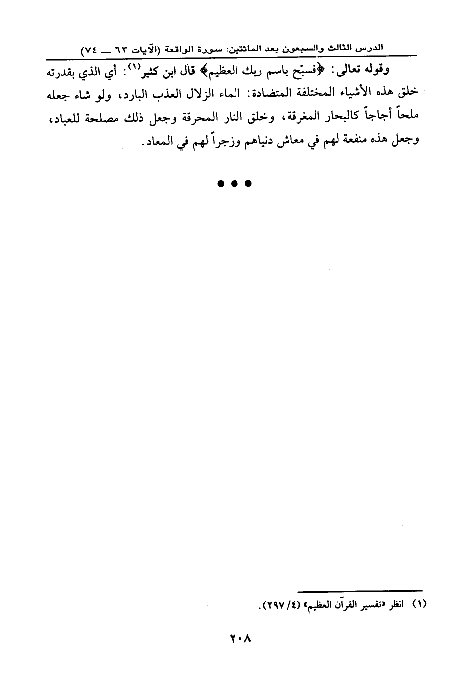 وقوله تعالى: {فَسَبِّحْ بِاسْمِ رَبِّكَ الْعَظِيمِ} ، قال ابن كثير: أي: الذي بقدرته خلق هذه الأشياء المختلفة المتضادة: الماء الزلال العذب البارد، ولو شاء جعله ملحًا أجاجًا كالبحار المغرقة، وخلق النار المحرقة