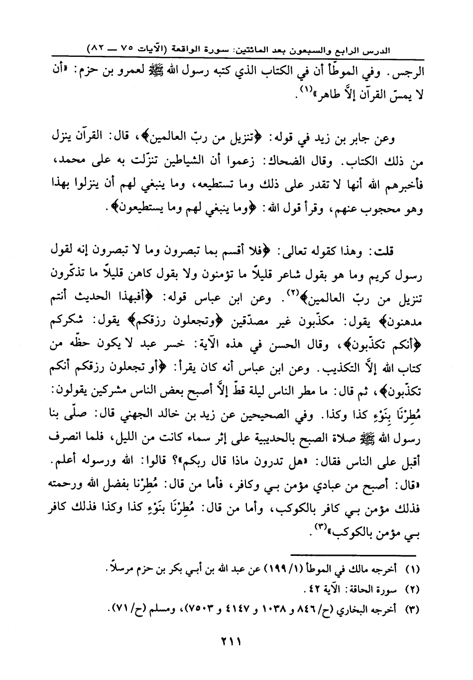 قلت: وهذا كقوله تعالى: {فَلَا أُقْسِمُ بِمَا تُبْصِرُونَ * وَمَا لَا تُبْصِرُونَ * إِنَّهُ لَقَوْلُ رَسُولٍ كَرِيمٍ * وَمَا هُوَ بِقَوْلِ شَاعِرٍ قَلِيلاً مَا تُؤْمِنُونَ * وَلَا بِقَوْلِ كَاهِنٍ قَلِيلاً مَا تَذَكَّرُونَ * تَنزِيلٌ مِّن رَّبِّ الْعَالَمِينَ} . وعن ابن عباس: قوله: {أَفَبِهَذَا الْحَدِيثِ أَنتُم مُّدْهِنُونَ} ، يقول: مكذّبون غير مصدّقين {وَتَجْعَلُونَ رِزْقَكُمْ} ، يقول: شكركم {أَنَّكُمْ تُكَذِّبُونَ} ، وقال الحسن في هذه الآية: خسر عبد لا يكون حظّه من كتاب الله إلا التكذيب. وعن ابن عباس أنه كان يقرأ: {وَتَجْعَلُونَ رِزْقَكُمْ أَنَّكُمْ تُكَذِّبُونَ} ، ثم قال: ما مطر الناس ليلة قطّ إلا أصبح بعض الناس مشركين يقولون: مُطِرْنَا بِنَوْءِ كذا وكذا. وفي الصحيحين عن زيد بن خالد الجهني قال: صلّى بنا رسول الله - صلى الله عليه وسلم - صلاة الصبح بالحديبية على إثر سماء كانت من الليل، فلما انصرف أقبل على الناس فقال: «هل تدرون ماذا قال ربكم» ؟ قالوا: الله ورسوله أعلم. قال: «أصبح من