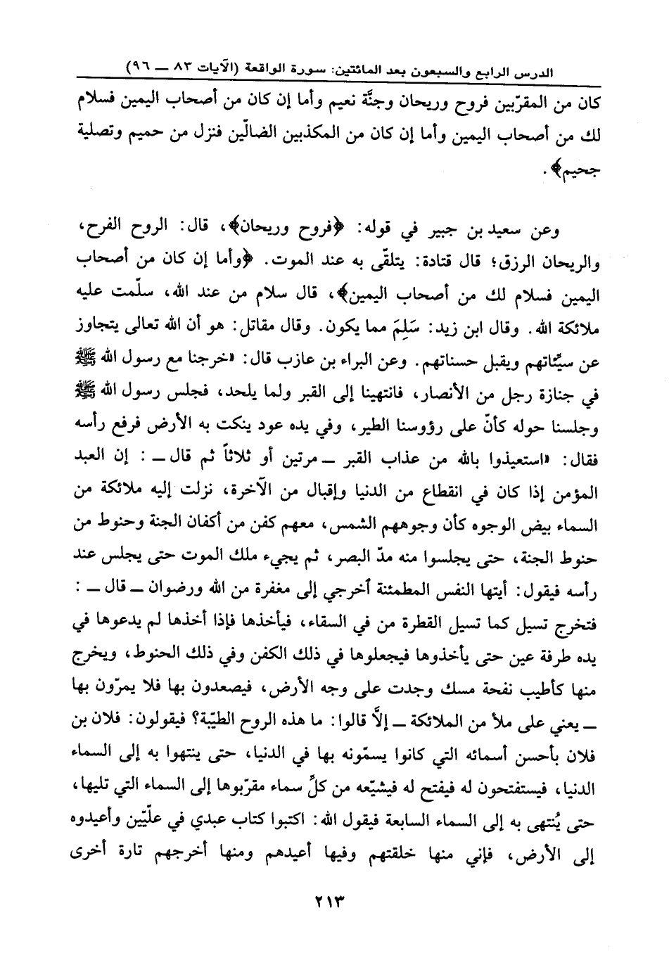 وعن سعيد بن جبير في قوله: {فَرَوْحٌ وَرَيْحَانٌ} ، قال: الروح: الفرح. والريحان: الرزق؛ قال قتادة: يتلقّى به عند الموت. {وَأَمَّا إِن كَانَ مِنَ أَصْحَابِ الْيَمِينِ * فَسَلَامٌ لَّكَ مِنْ أَصْحَابِ الْيَمِينِ} ، قال: سلام من عند الله، سلّمت عليه ملائكة الله. وقال ابن زيد: سَلِمَ مما يكون. وقال مقاتل: هو أن الله تعالى يتجاوز عن سيِّئاتهم ويقبل حسناتهم. وعن البراء بن عازب قال: خرجنا مع رسول الله - صلى الله عليه وسلم - في جنازة رجل من الأنصار فانتهينا إلى القبر ولما يلحد فجلس رسول الله - صلى الله عليه وسلم - وجلسنا حوله كأنّ على رؤوسنا الطير، وفي يده عود ينكت به الأرض فرفع رأسه فقال: «استعيذوا بالله من عذاب القبر - مرتين أو ثلاثًا ثم قال -: إن العبد المؤمن إذا كان في انقطاع من الدنيا وإقبال من الآخرة، نزلت إليه ملائكة من السماء بيض الوجوه كأن وجوههم الشمس،