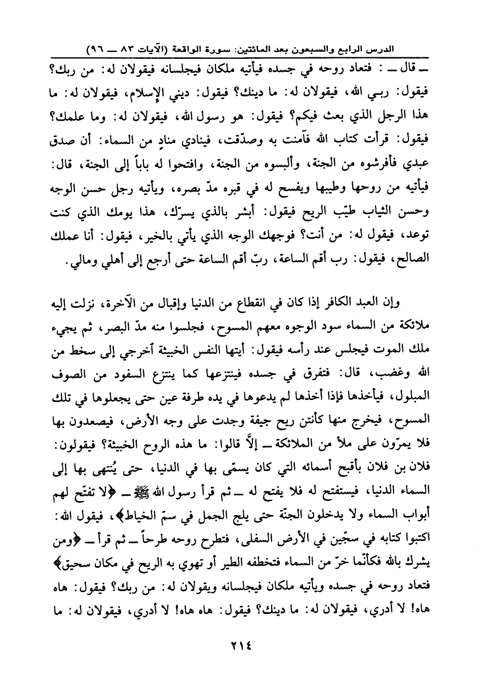 وإن العبد الكافر إذا كان في انقطاع من الدنيا وإقبال من الآخرة، نزلت إليه ملائكة من السماء سود الوجوه معهم المسوح، فجلسوا منه مدّ البصر، ثم يجيء ملك الموت فيجلس عند رأسه فيقول: أيتها النفس الخبيثة اخرجي إلى سخط من الله وغضب، قال: فتفرق في جسده فينتزعها كما ينتزع السفود من الصوف المبلول، فيأخذها فإذا أخذها لم يدعوها في يده طرفة عين حتى يجعلوها في تلك المسوح، فيخرج منها كأنتن ريح جيفة وجدت على الأرض، فيصعدون بها فلا يمرّون على ملأ من الملائكة إلا قالوا: ما هذه الروح الخبيثة؟ فيقولون: فلان بن فلان بأقبح أسمائه التي كان يسمّى بها في الدنيا، حتى يُنتهى بها إلى السماء الدنيا، فيستفتح له فلا يفتح له - ثم قرأ رسول الله - صلى الله عليه وسلم -: {لاَ تُفَتَّحُ لَهُمْ أَبْوَابُ السَّمَاء وَلاَ يَدْخُلُونَ الْجَنَّةَ حَتَّى يَلِجَ الْجَمَلُ فِي سَمِّ الْخِيَاطِ} فيقول الله: اكتبوا كتابه في سجّين في الأرض السفلى، فتطرح روحه طرحًا - ثم قرأ -: {وَمَن يُشْرِكْ بِاللَّهِ فَكَأَنَّمَا خَرَّ مِنَ السَّمَاء فَتَخْطَفُهُ الطَّيْرُ أَوْ تَهْوِي بِهِ الرِّيحُ فِي مَكَانٍ سَحِيقٍ} فتعاد روحه في جسده ويأتيه ملكان فيجلسانه ويقولان له: من ربك؟ فيقول: هاه هاه! لا أدري، فيقولان له: ما دينك؟ فيقول: هاه هاه! لا أدري، فيقولان له: ما