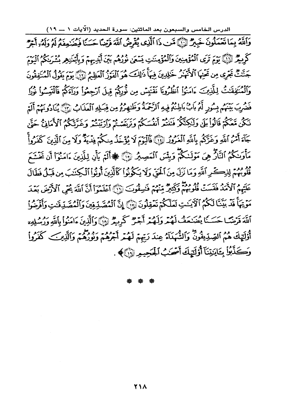 حَسَناً فَيُضَاعِفَهُ لَهُ وَلَهُ أَجْرٌ كَرِيمٌ (11) يَوْمَ تَرَى الْمُؤْمِنِينَ وَالْمُؤْمِنَاتِ يَسْعَى نُورُهُم بَيْنَ أَيْدِيهِمْ وَبِأَيْمَانِهِم بُشْرَاكُمُ الْيَوْمَ جَنَّاتٌ تَجْرِي مِن تَحْتِهَا الْأَنْهَارُ خَالِدِينَ فِيهَا ذَلِكَ هُوَ الْفَوْزُ الْعَظِيمُ (12) يَوْمَ يَقُولُ الْمُنَافِقُونَ وَالْمُنَافِقَاتُ لِلَّذِينَ آمَنُوا انظُرُونَا نَقْتَبِسْ مِن نُّورِكُمْ قِيلَ ارْجِعُوا وَرَاءكُمْ فَالْتَمِسُوا نُوراً فَضُرِبَ بَيْنَهُم بِسُورٍ لَّهُ بَابٌ بَاطِنُهُ فِيهِ الرَّحْمَةُ وَظَاهِرُهُ مِن قِبَلِهِ الْعَذَابُ (13) يُنَادُونَهُمْ أَلَمْ نَكُن مَّعَكُمْ قَالُوا بَلَى وَلَكِنَّكُمْ فَتَنتُمْ أَنفُسَكُمْ وَتَرَبَّصْتُمْ وَارْتَبْتُمْ وَغَرَّتْكُمُ الْأَمَانِيُّ حَتَّى جَاء أَمْرُ اللَّهِ وَغَرَّكُم بِاللَّهِ الْغَرُورُ (14) فَالْيَوْمَ لَا يُؤْخَذُ مِنكُمْ فِدْيَةٌ وَلَا مِنَ الَّذِينَ كَفَرُوا مَأْوَاكُمُ النَّارُ هِيَ مَوْلَاكُمْ وَبِئْسَ الْمَصِيرُ (15) أَلَمْ يَأْنِ لِلَّذِينَ آمَنُوا أَن تَخْشَعَ قُلُوبُهُمْ لِذِكْرِ اللَّهِ وَمَا نَزَلَ مِنَ الْحَقِّ وَلَا يَكُونُوا كَالَّذِينَ أُوتُوا الْكِتَابَ مِن قَبْلُ فَطَالَ عَلَيْهِمُ الْأَمَدُ فَقَسَتْ قُلُوبُهُمْ وَكَثِيرٌ مِّنْهُمْ فَاسِقُونَ (16) اعْلَمُوا أَنَّ اللَّهَ يُحْيِي الْأَرْضَ بَعْدَ مَوْتِهَا قَدْ بَيَّنَّا لَكُمُ الْآيَاتِ لَعَلَّكُمْ تَعْقِلُونَ (17) إِنَّ الْمُصَّدِّقِينَ وَالْمُصَّدِّقَاتِ وَأَقْرَضُوا اللَّهَ قَرْضاً حَسَناً يُضَاعَفُ لَهُمْ وَلَهُمْ أَجْرٌ كَرِيمٌ (18) وَالَّذِينَ آمَنُوا بِاللَّهِ وَرُسُلِهِ أُوْلَئِكَ هُمُ الصِّدِّيقُونَ وَالشُّهَدَاء عِندَ رَبِّهِمْ لَهُمْ أَجْرُهُمْ وَنُورُهُمْ وَالَّذِينَ كَفَرُوا وَكَذَّبُوا بِآيَاتِنَا أُوْلَئِكَ أَصْحَابُ الْجَحِيمِ (19) } .