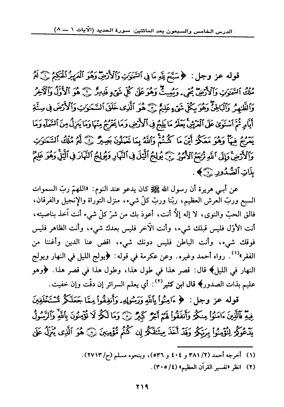 قوله عز وجل: {سَبَّحَ لِلَّهِ مَا فِي السَّمَاوَاتِ وَالْأَرْضِ وَهُوَ الْعَزِيزُ الْحَكِيمُ (1) لَهُ مُلْكُ السَّمَاوَاتِ وَالْأَرْضِ يُحْيِي وَيُمِيتُ وَهُوَ عَلَى كُلِّ شَيْءٍ قَدِيرٌ (2) هُوَ الْأَوَّلُ وَالْآخِرُ وَالظَّاهِرُ وَالْبَاطِنُ وَهُوَ بِكُلِّ شَيْءٍ عَلِيمٌ (3) هُوَ الَّذِي خَلَقَ السَّمَاوَاتِ وَالْأَرْضَ فِي سِتَّةِ أَيَّامٍ ثُمَّ اسْتَوَى عَلَى الْعَرْشِ يَعْلَمُ مَا يَلِجُ فِي الْأَرْضِ وَمَا يَخْرُجُ مِنْهَا وَمَا يَنزِلُ مِنَ السَّمَاء وَمَا يَعْرُجُ فِيهَا وَهُوَ مَعَكُمْ أَيْنَ مَا كُنتُمْ وَاللَّهُ بِمَا تَعْمَلُونَ بَصِيرٌ (4) لَهُ مُلْكُ السَّمَاوَاتِ وَالْأَرْضِ وَإِلَى اللَّهِ تُرْجَعُ الأمُورُ (5) يُولِجُ اللَّيْلَ فِي النَّهَارِ وَيُولِجُ النَّهَارَ فِي اللَّيْلِ وَهُوَ عَلِيمٌ بِذَاتِ الصُّدُورِ ... (6) } .