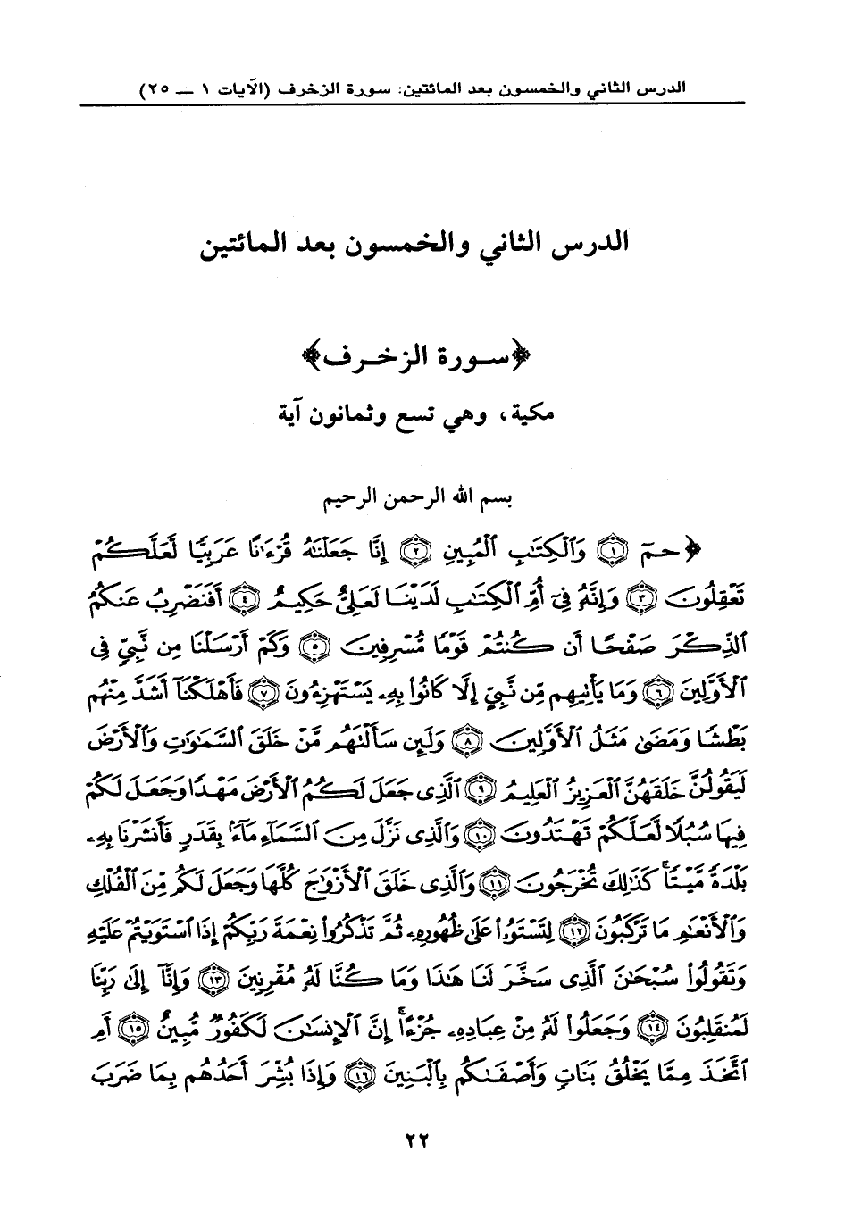 {حم (1) وَالْكِتَابِ الْمُبِينِ (2) إِنَّا جَعَلْنَاهُ قُرْآناً عَرَبِيّاً لَّعَلَّكُمْ تَعْقِلُونَ (3) وَإِنَّهُ فِي أُمِّ الْكِتَابِ لَدَيْنَا لَعَلِيٌّ حَكِيمٌ (4) أَفَنَضْرِبُ عَنكُمُ الذِّكْرَ صَفْحاً أَن كُنتُمْ قَوْماً مُّسْرِفِينَ (5) وَكَمْ أَرْسَلْنَا مِن نَّبِيٍّ فِي الْأَوَّلِينَ (6) وَمَا يَأْتِيهِم مِّن نَّبِيٍّ إِلَّا كَانُوا بِهِ يَسْتَهْزِئُون (7) فَأَهْلَكْنَا أَشَدَّ مِنْهُم بَطْشاً وَمَضَى مَثَلُ الْأَوَّلِينَ (8) وَلَئِن سَأَلْتَهُم مَّنْ خَلَقَ السَّمَاوَاتِ وَالْأَرْضَ لَيَقُولُنَّ خَلَقَهُنَّ الْعَزِيزُ الْعَلِيمُ (9) الَّذِي جَعَلَ لَكُمُ الْأَرْضَ مَهْداً وَجَعَلَ لَكُمْ فِيهَا سُبُلاً لَّعَلَّكُمْ تَهْتَدُونَ (10) وَالَّذِي نَزَّلَ مِنَ السَّمَاءِ مَاءً بِقَدَرٍ فَأَنشَرْنَا بِهِ بَلْدَةً مَّيْتاً كَذَلِكَ تُخْرَجُونَ (11) وَالَّذِي خَلَقَ الْأَزْوَاجَ كُلَّهَا وَجَعَلَ لَكُم مِّنَ الْفُلْكِ وَالْأَنْعَامِ مَا تَرْكَبُونَ (12) لِتَسْتَوُوا عَلَى ظُهُورِهِ ثُمَّ تَذْكُرُوا نِعْمَةَ رَبِّكُمْ إِذَا اسْتَوَيْتُمْ عَلَيْهِ وَتَقُولُوا سُبْحانَ الَّذِي سَخَّرَ لَنَا هَذَا وَمَا كُنَّا لَهُ مُقْرِنِينَ (13) وَإِنَّا إِلَى رَبِّنَا لَمُنقَلِبُونَ (14) وَجَعَلُوا لَهُ مِنْ عِبَادِهِ جُزْءاً إِنَّ الْإِنسَانَ لَكَفُورٌ مُّبِينٌ (15) أَمِ اتَّخَذَ مِمَّا يَخْلُقُ بَنَاتٍ وَأَصْفَاكُم بِالْبَنِينَ (16) وَإِذَا بُشِّرَ أَحَدُهُم بِمَا ضَرَبَ